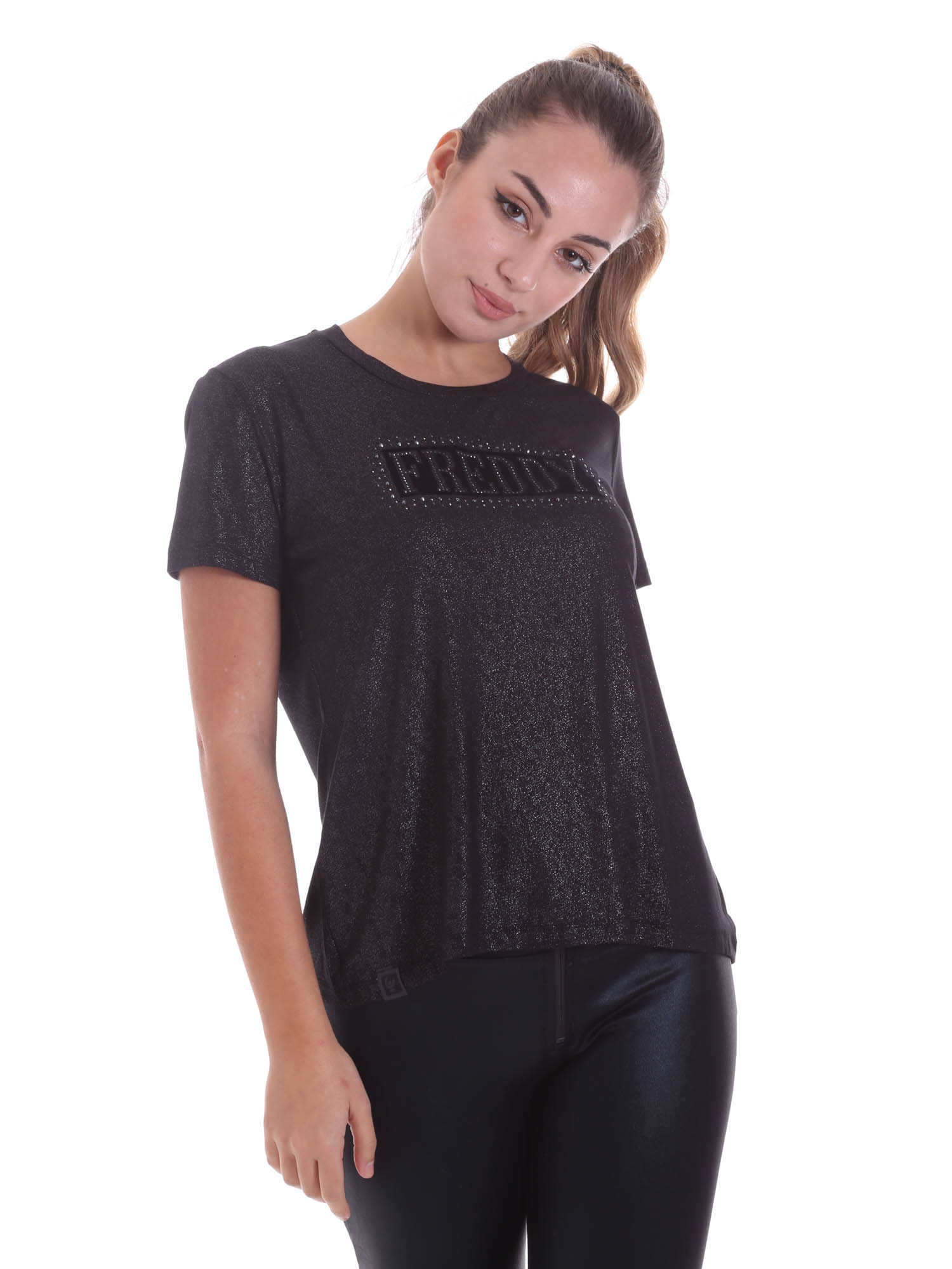 Description: T-shirt en jersey de viscose stretch à effet pailleté, orné sur le devant d'une écriture composée de strass et de micro clous.