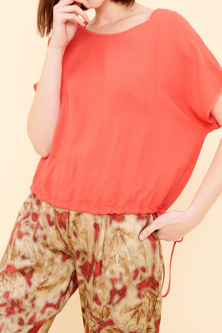 Blouse unie manches courtes, bas coulissé resserrable par liens à nouer sur les côtés, col arrondi