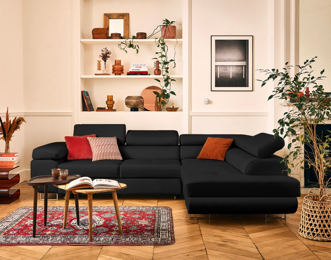 • Présentation de la collection : Succombez au design et au revêtement tendance du canapé d'angle 5 places Zaria. Vous allez adorer sa fonction convertible, son coffre de rangement et ses têtières réglables !