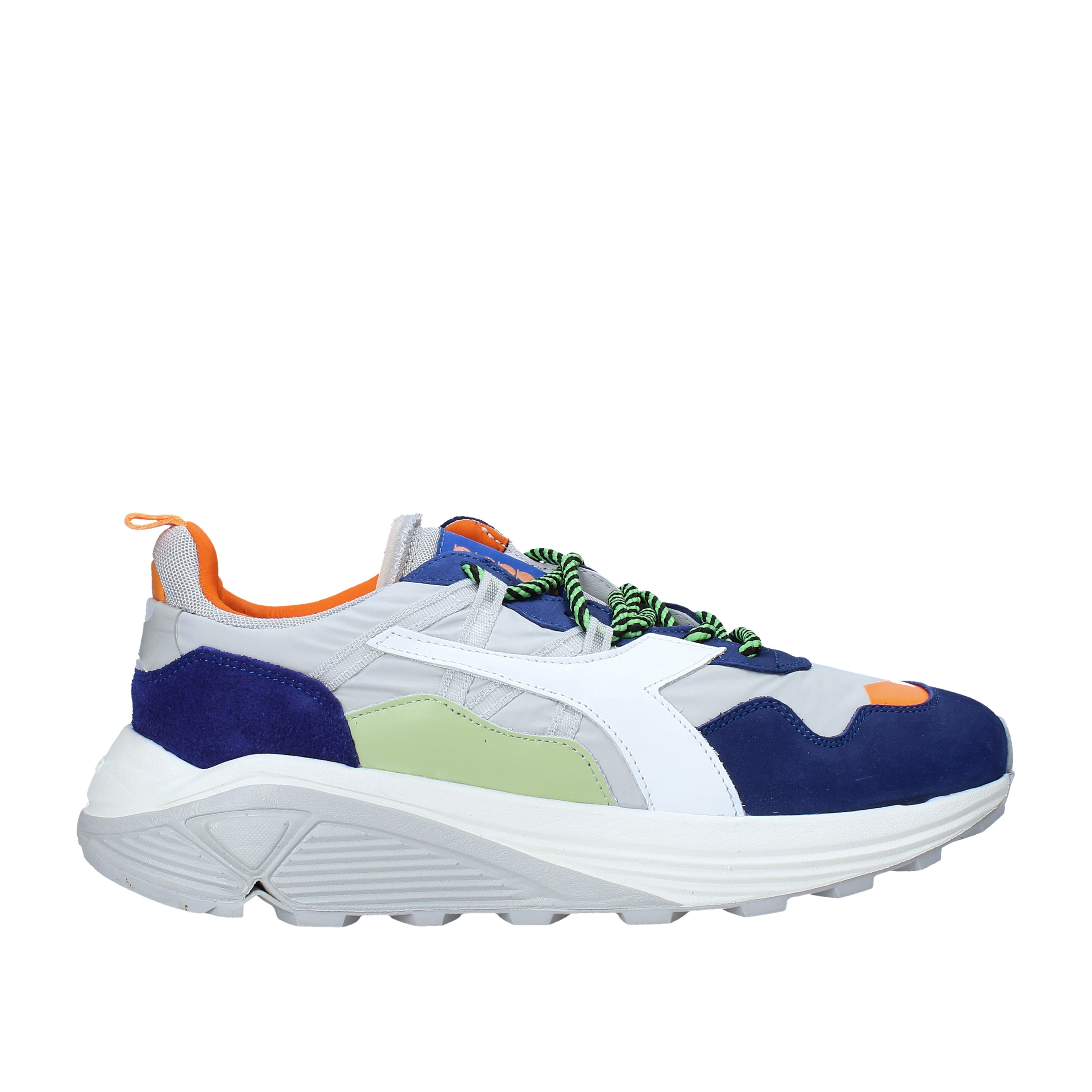 Description: le Rave Nylon de Diadora Heritage en gris, fait de nylon de première qualité, de cuir et de nubuck de première qualité avec des inserts bleus, orange et beige, a une chaussette en néoprène, la technologie Vibram dans la semelle inspirée du trail des années 90 pour reprendre la bande de roulement pour les terrains escarpés .