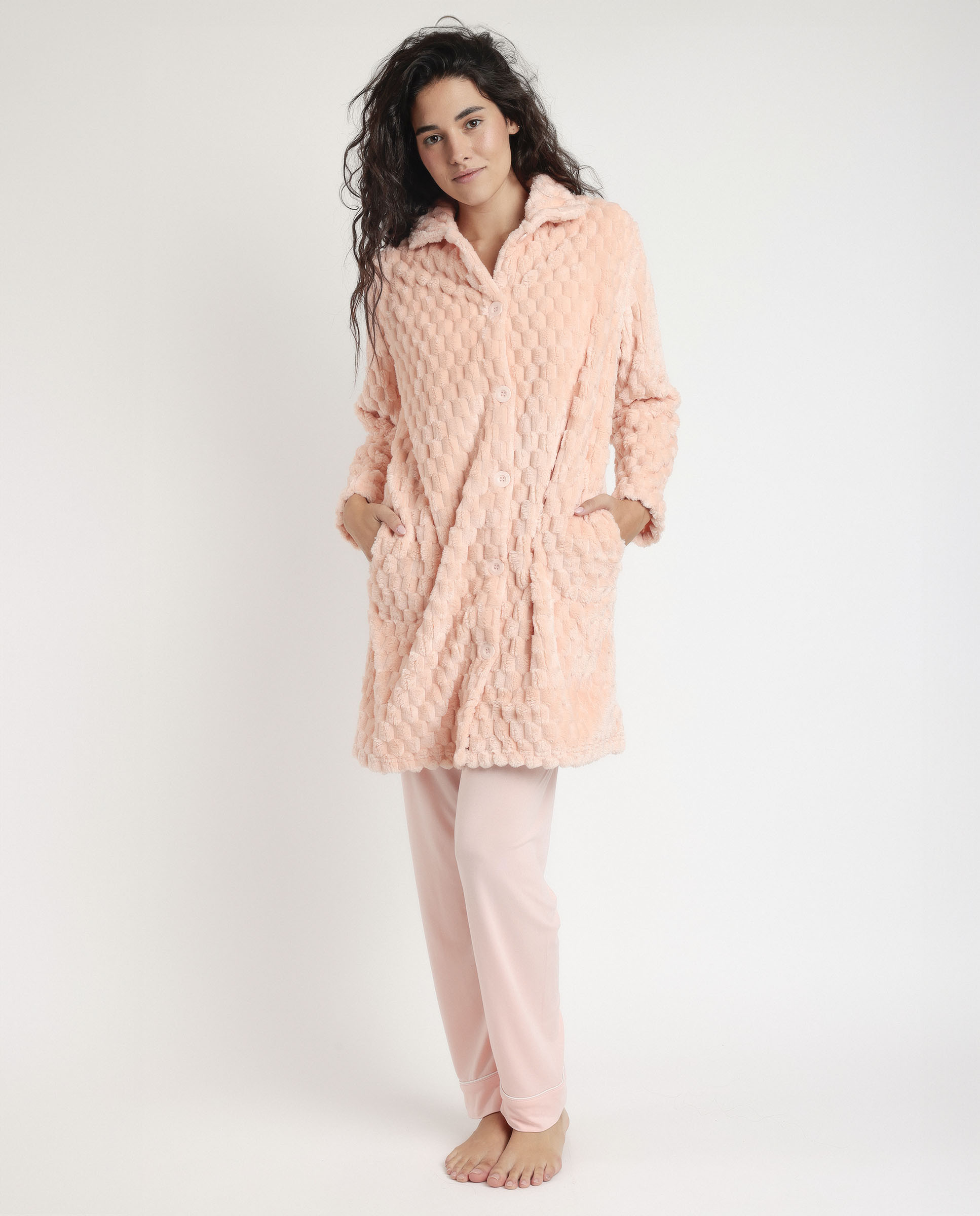 * Peignoir en tissu jacquard spécial Corel très chaud, en deux combinaisons de couleurs : corail et moka.