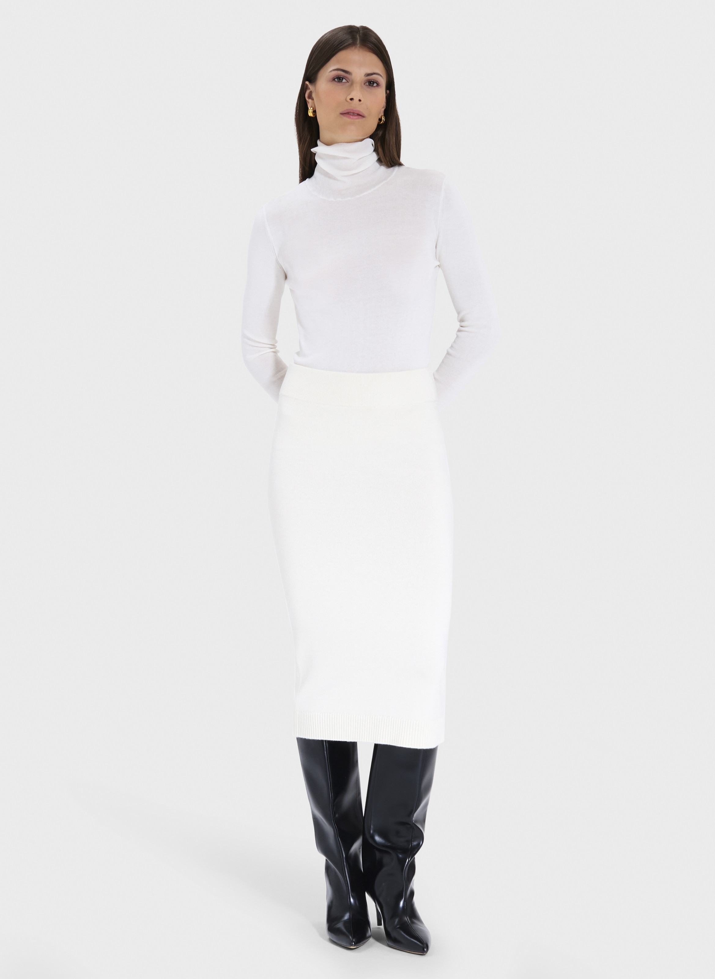 Affirmez votre élégance avec cette jupe crayon en maille haut de gamme. Sa coupe mi-longue et taille haute mettent en valeur votre silhouette avec finesse. Disponible dans un coloris écru intemporel, portez-la en total look avec le pull NELANI. Jupe crayon en maille Mi-longue Taille haute Coloris écru