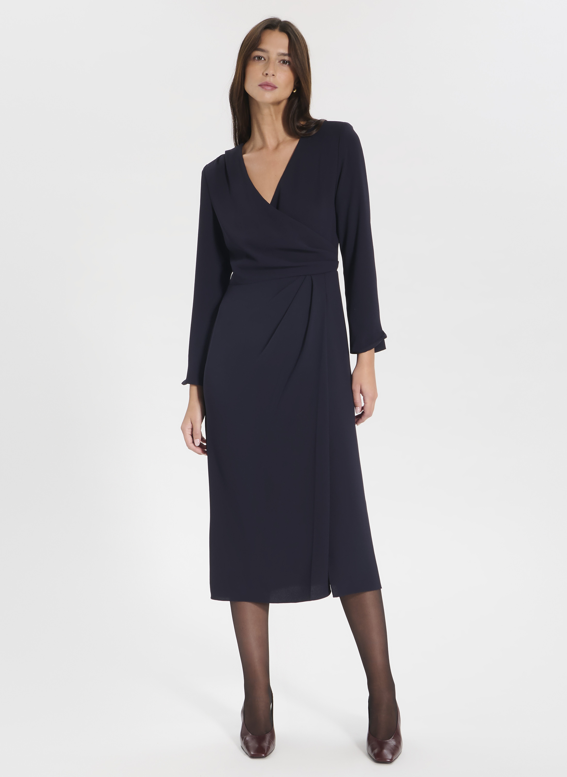 Adoptez une allure chic avec cette robe portefeuille, parfaite pour toute occasion. Dotée d'un délicat col V, cette robe offre aussi un effet plissé féminin et élégant. Robe longue Coupe portefeuille Col V Manches longues Effet plissé Coloris nocturne