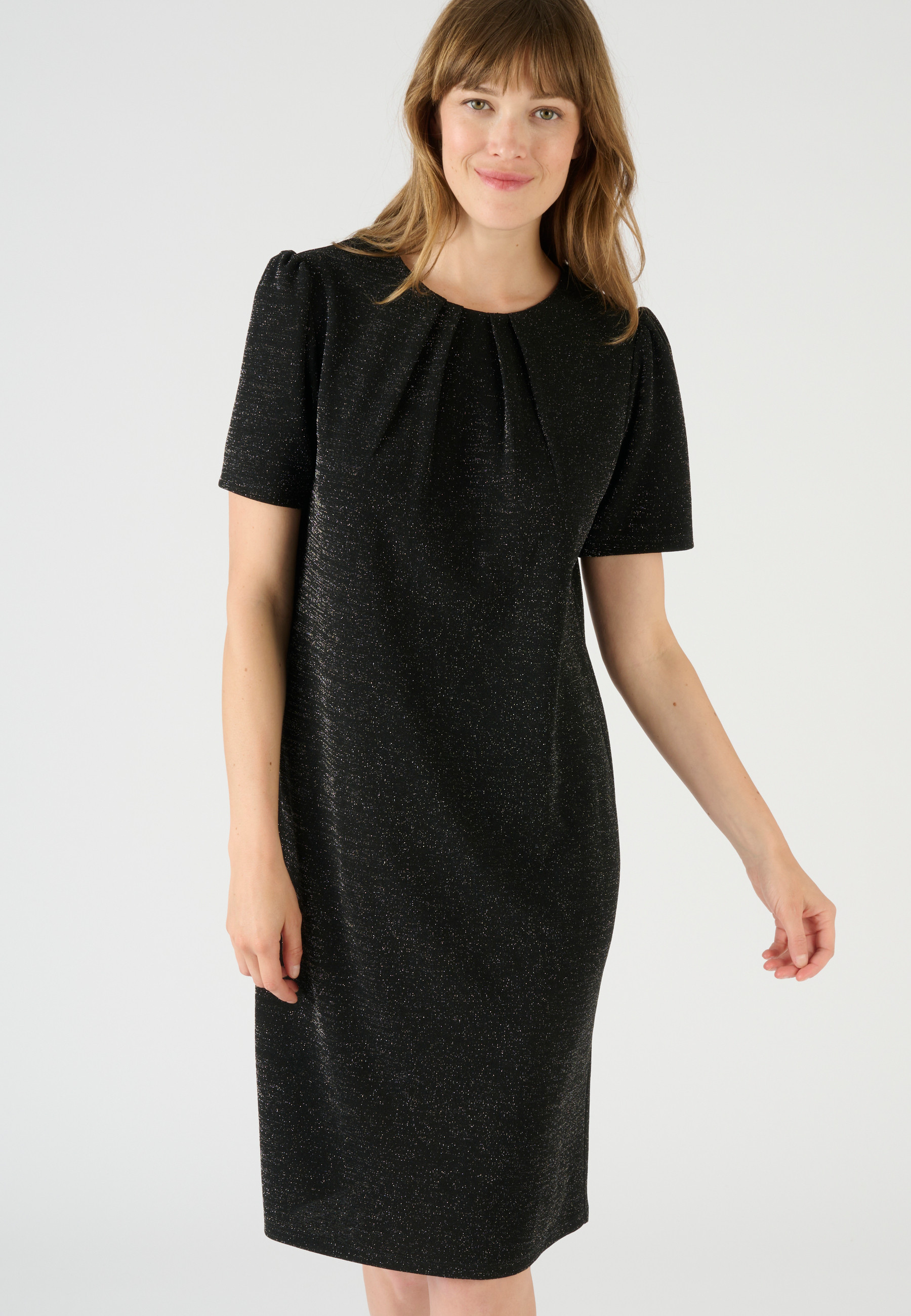Information sur l'offre : Une coupe tout en sobriété, droite avec de petits plis sous l'encolure apportant un peu d'aisance, des manches courtes, une longueur parfaite, une maille fluide et extensible : de bonnes bases pour cette jolie robe noire. Ajoutez-lui un fil brillant qui rend sa maille scintillante, et voilà qu'elle se révèle être LA petite pépite, qui s'invitera volontiers dans toutes vos fêtes et sorties habillées. A porter avec une paire d'escarpins si vous souhaitez accentuer son côté chic, de petites boots à talon pour un look moderne. Les plus audacieuses oseront même la paire de baskets... très tendance ! Fermée par bouton et lichette au dos, cette robe de fête est facile à enfiler. Longueur 97 cm environ.