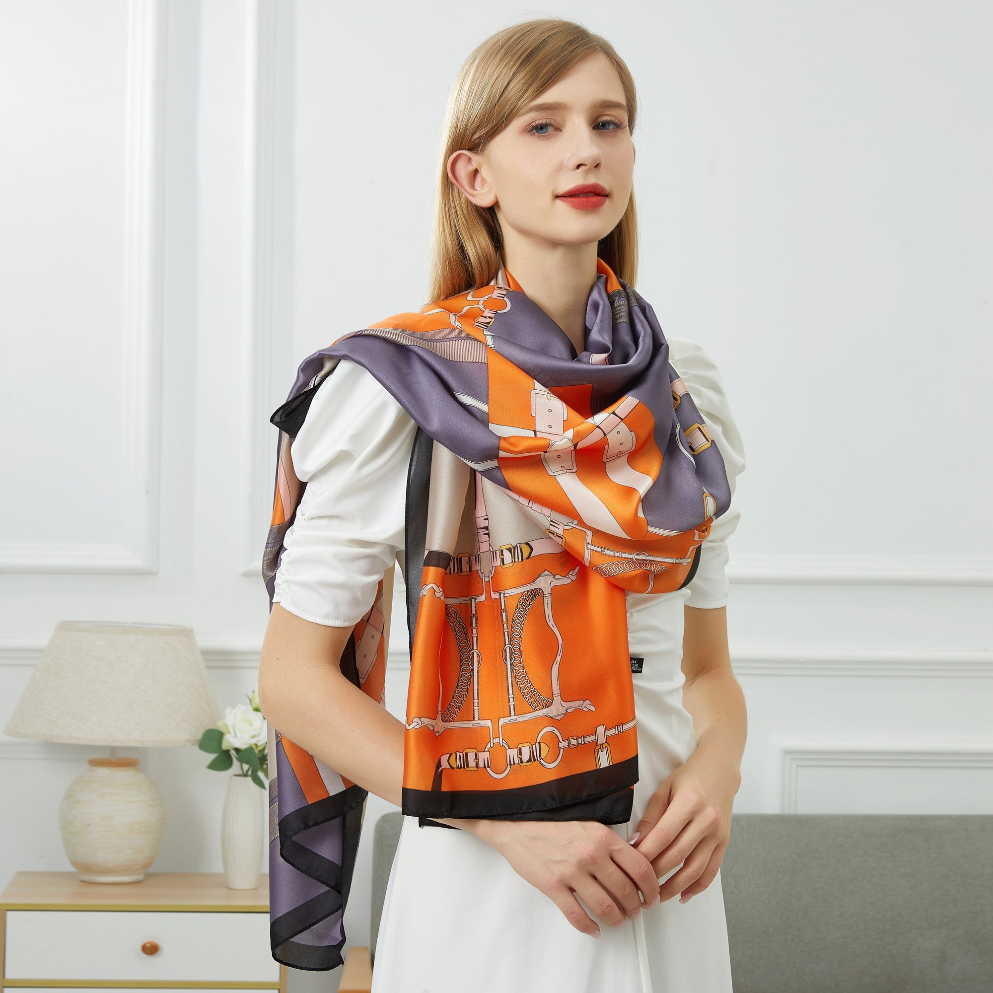 Inspirée par les motifs équestres et la chaleur des agrumes, cette étole se démarque par ses couleurs vibrantes d'orange, de gris et de beige, rehaussées par des bordures noires. Avec des dimensions généreuses de 180x90 cm, elle se prête à de multiples styles : en châle, en foulard ou en écharpe, apportant une touche de raffinement à votre look.