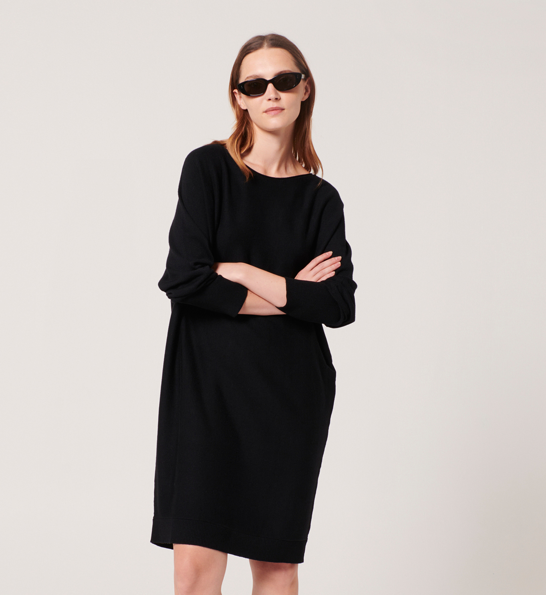 RENDY est une robe en maille indispensable à votre garde-robe. Sa coupe ample et mi-longue apporte de la légereté et du confort à vos mouvements.  Robe mi-longue à manches longues Coupe ample Col bateau  Coloris noir Longueur : 89 cm