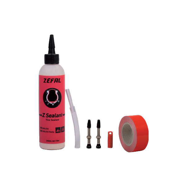 Le kit tubeless Zéfal contient tout le nécessaire pour le Tubeless : bandes autocollantes spécifiques, préventif anti-crevaison Z-Sealant, valves coniques et démonte-obus. Les bandes Tubeless bi-matières ont été développées pour garantir une résistance à la pression et une durabilité remarquables. L'ajout de l'adhésif élastomère permet de prévenir les infiltrations du préventif dans la jante. Enfin, grâce à leur légère élasticité, le montage des bandes est simplifié et peut se faire sans plis ni bulles.