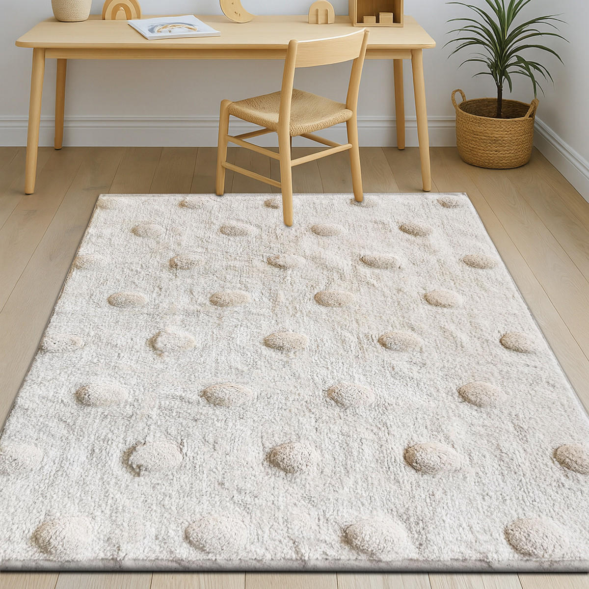 Tapis salon enfants lavable en coton à pois écru 100x150