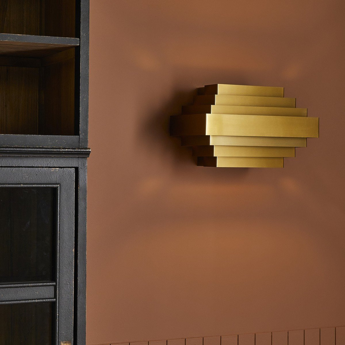 • Grande applique d'inspiration Art déco en métal doré. Applique composée de rectangles métalliques assemblés en formes pyramidales. 1 ampoule E27 40W