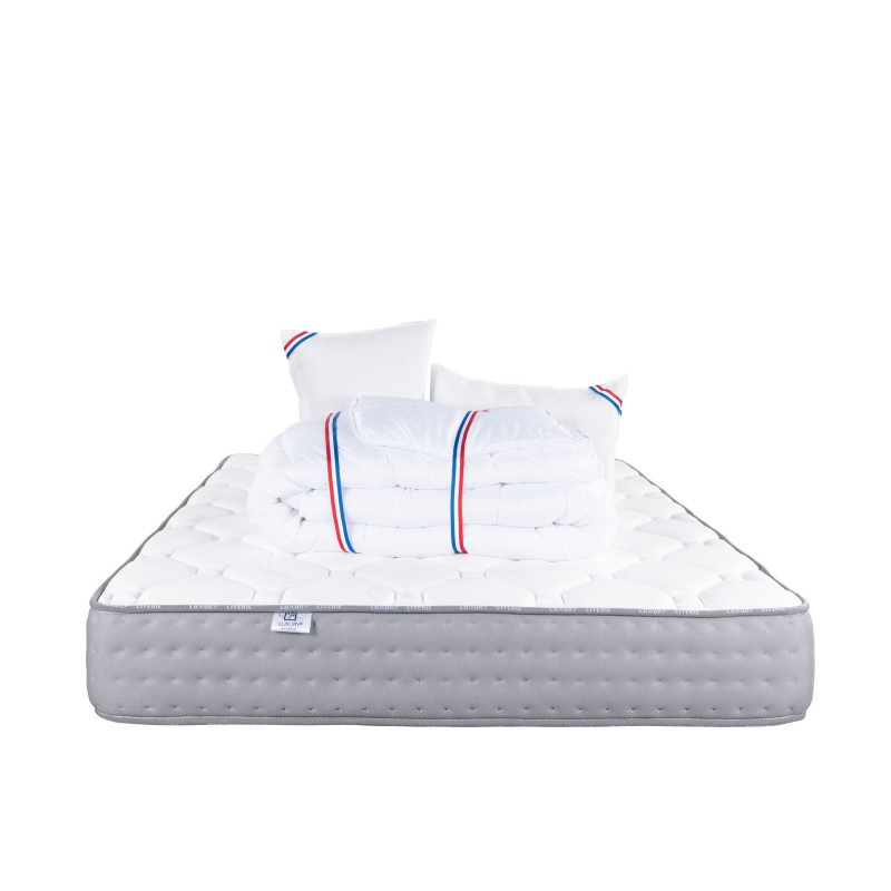 Ensemble matelas <> ferme 7/10, épaisseur 20cm + couette 450g + oreiller 60cm x 40cm un garnissage 100% mousse viscoélastique.