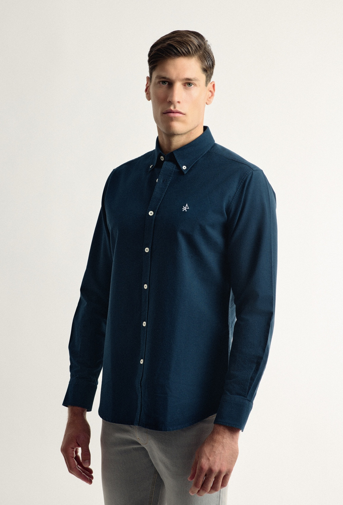 Chemise classique en coton Oxford avec col boutonné et écusson brodé sur la poitrine. Patte de boutonnage centrale avec boutons blancs personnalisés. Logo brodé sur la poitrine.
