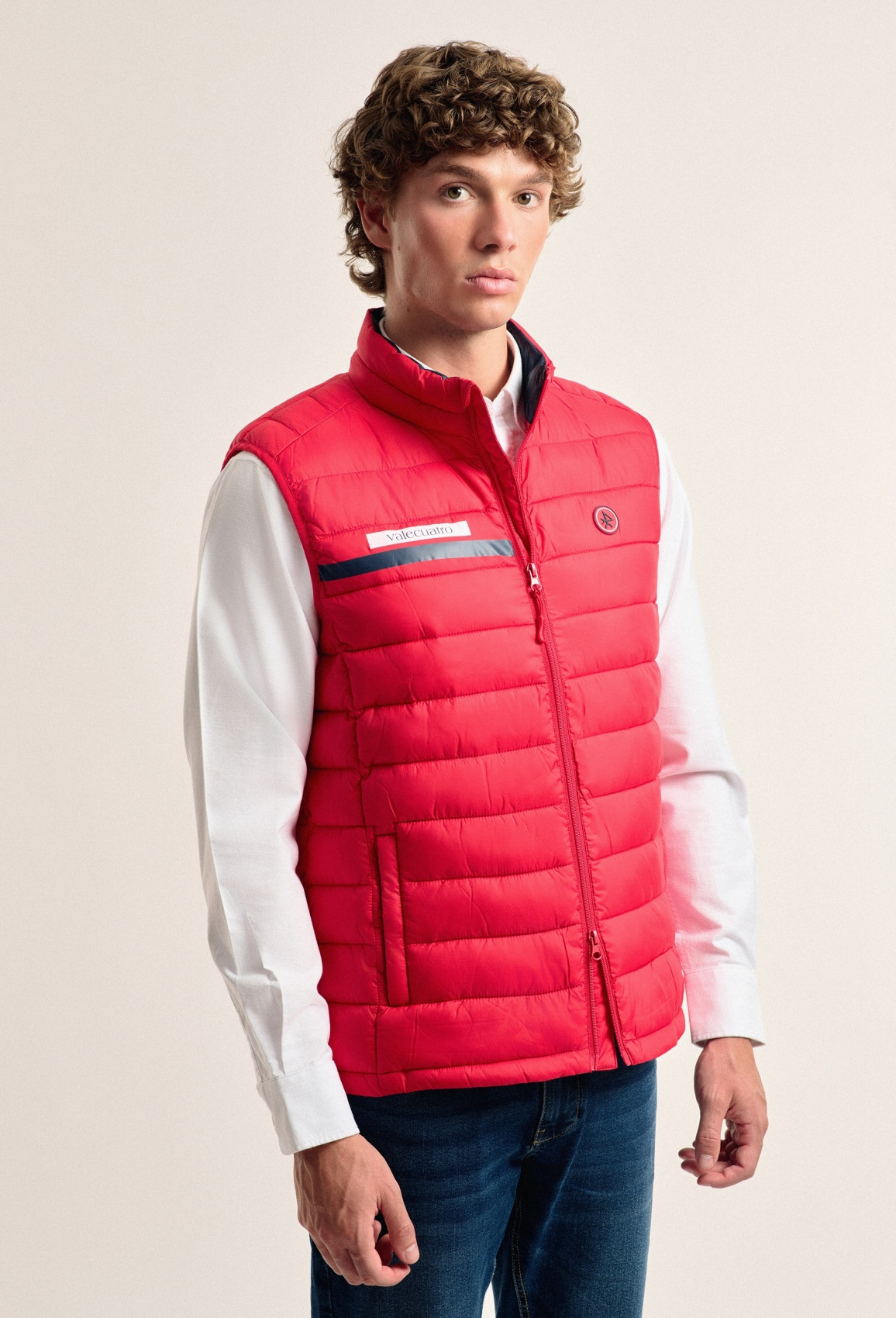 Gilet matelassé de coupe régulière. Il est doté d'une double fermeture à glissière et de poches zippées sur le devant. Tirettes personnalisées.