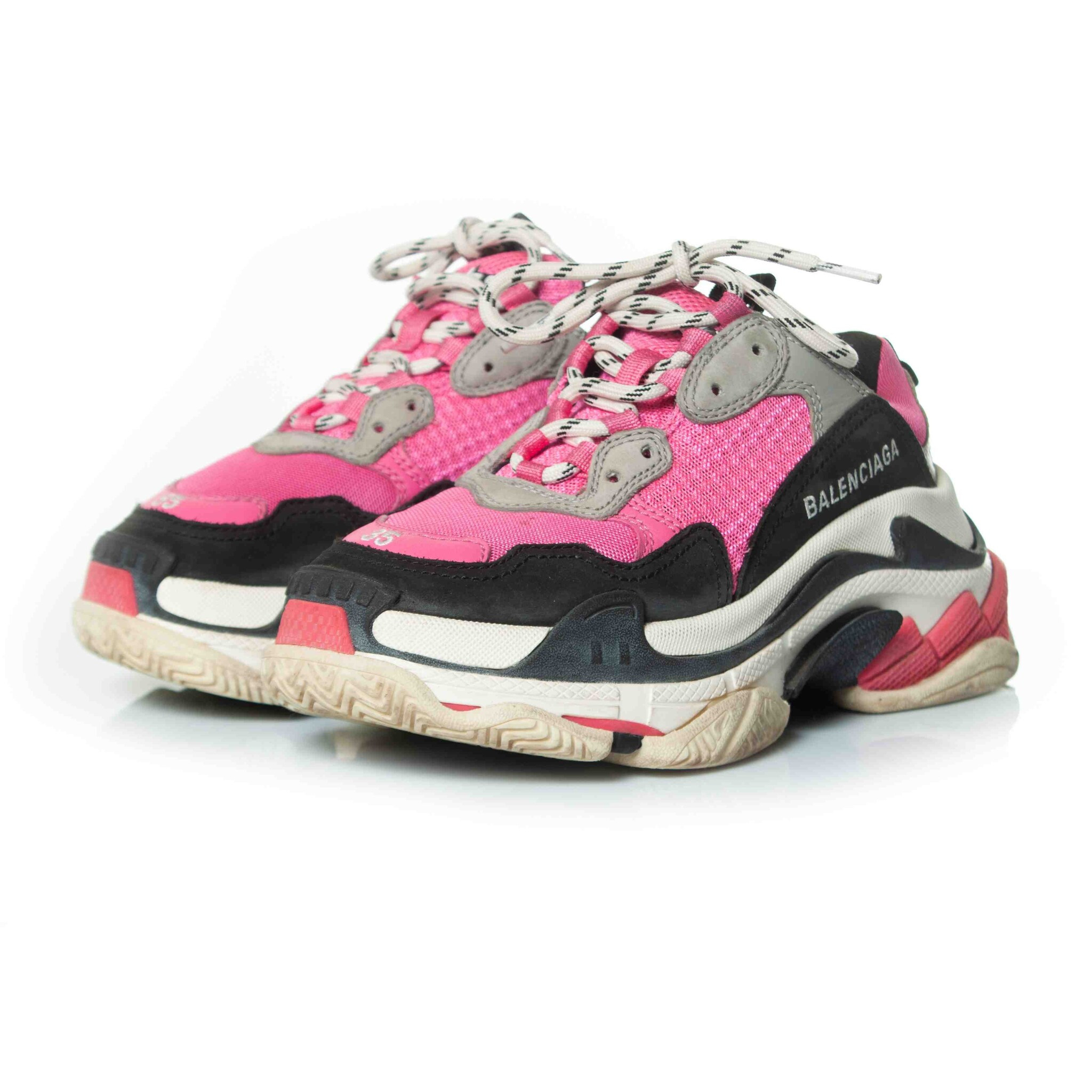 Baskets Balenciaga, Triple S en rose. L'article est en bon état. Petite tache sur le tissu. ÉTAT : bon état TAILLE : 35 MESURES DE LA SEMELLE INTÉRIEURE : 23 cm MESURES DU TALON : 5 cm PLATEFORME : 3 cm MATÉRIEL : tissu, daim COULEUR : roseMesures :
