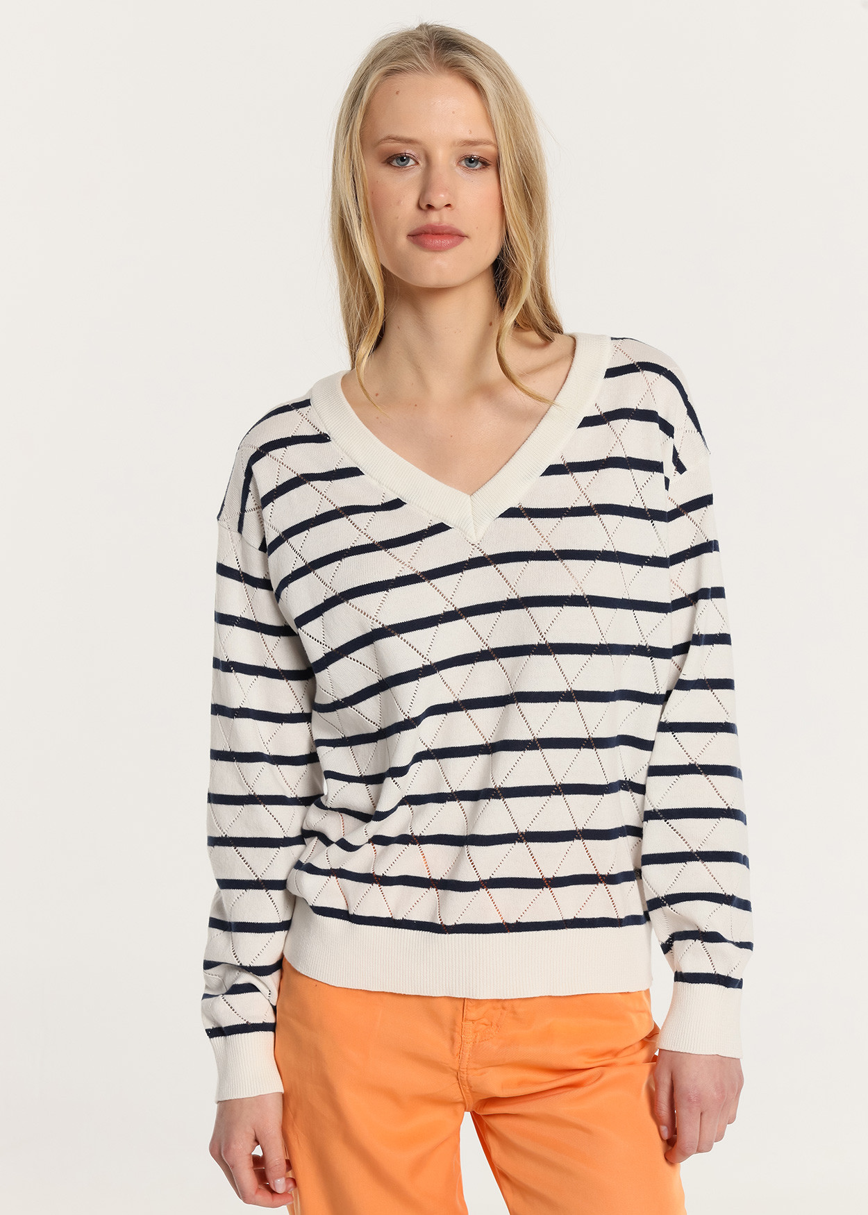 Information sur l'offre : Le pull rayé à col V LOIS WOMEN'S-NAYLA-LOWEN est un vêtement féminin de la marque LOIS, conçu spécialement pour les femmes. Ce pull présente un col V élégant et un motif rayé distinctif, lui conférant un style à la fois moderne et décontracté. Sa finition légèrement usée, avec de petits trous, lui donne un aspect volontairement patiné, ajoutant une touche tendance. De couleur blanche, ce pull est polyvalent et facile à associer à différentes tenues. Fabriqué en 100 % coton, il garantit confort, douceur et respirabilité, idéal en toute saison.