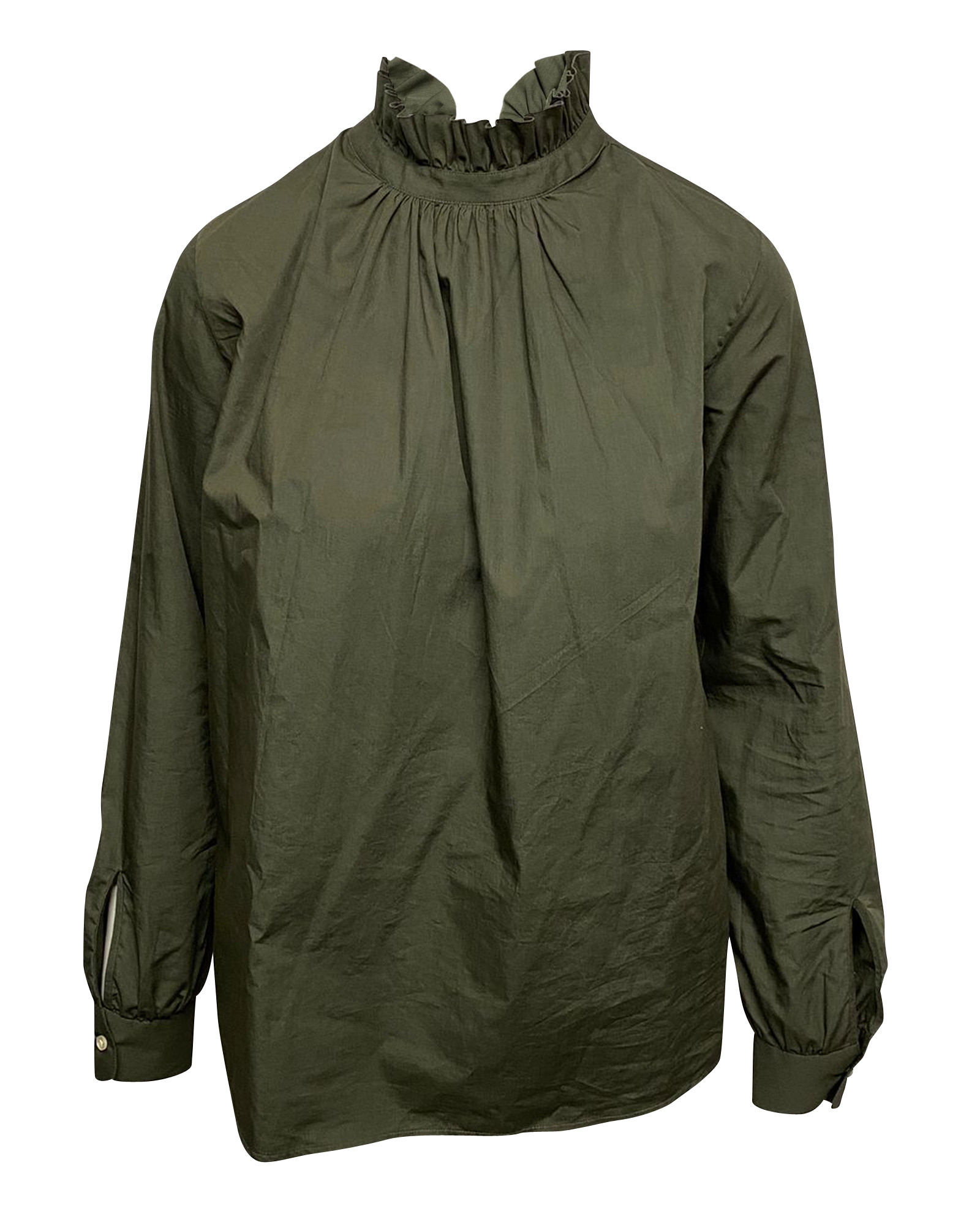 Le chemisier à col montant d'Officine Générale est confectionné en coton vert olive impeccable avec des plis sur le col. Il présente une silhouette ample et est doté de manches blousantes et de poignets boutonnés. Portez-le avec tout, des shorts en jean aux jupes midi. Chemisier Officine Générale en coton olive État : excellent Couleur : olive Matière : coton Taille : S/IT42/FR40/UK10 Signe d'usure : non SKU : 93956