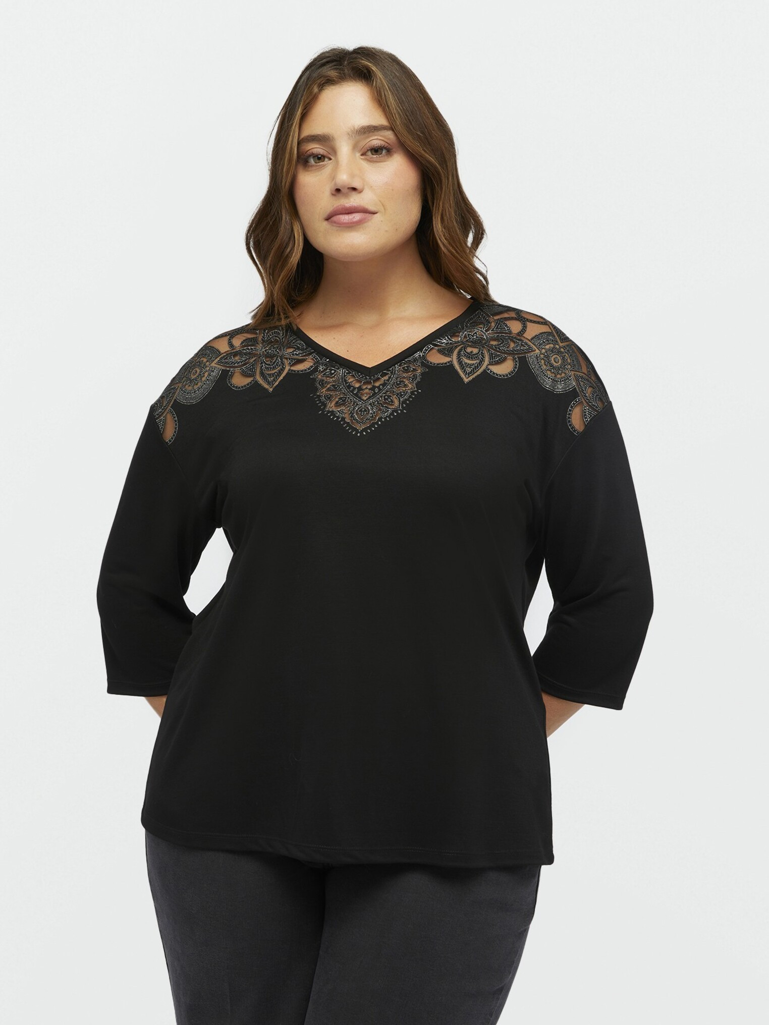 T-shirt avec le haut à effet dévoré et un dessin fleuri qui crée un jeu de transparences ; col en V et manches trois-quarts ; porté et coupe étudiés pour vous garantir le maximum de confort ; parfaite pour les occasions spéciales et pour les looks de tous les jours.