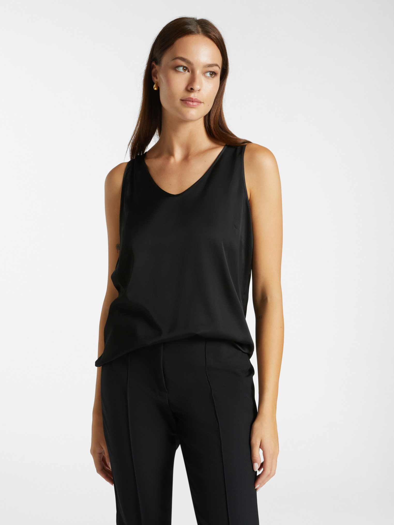 Haut en satin extensible ; Modèle débardeur, avec col en V doux ; Élégant et essentiel, à associer avec un cardigan, une chemise ou un blazer.