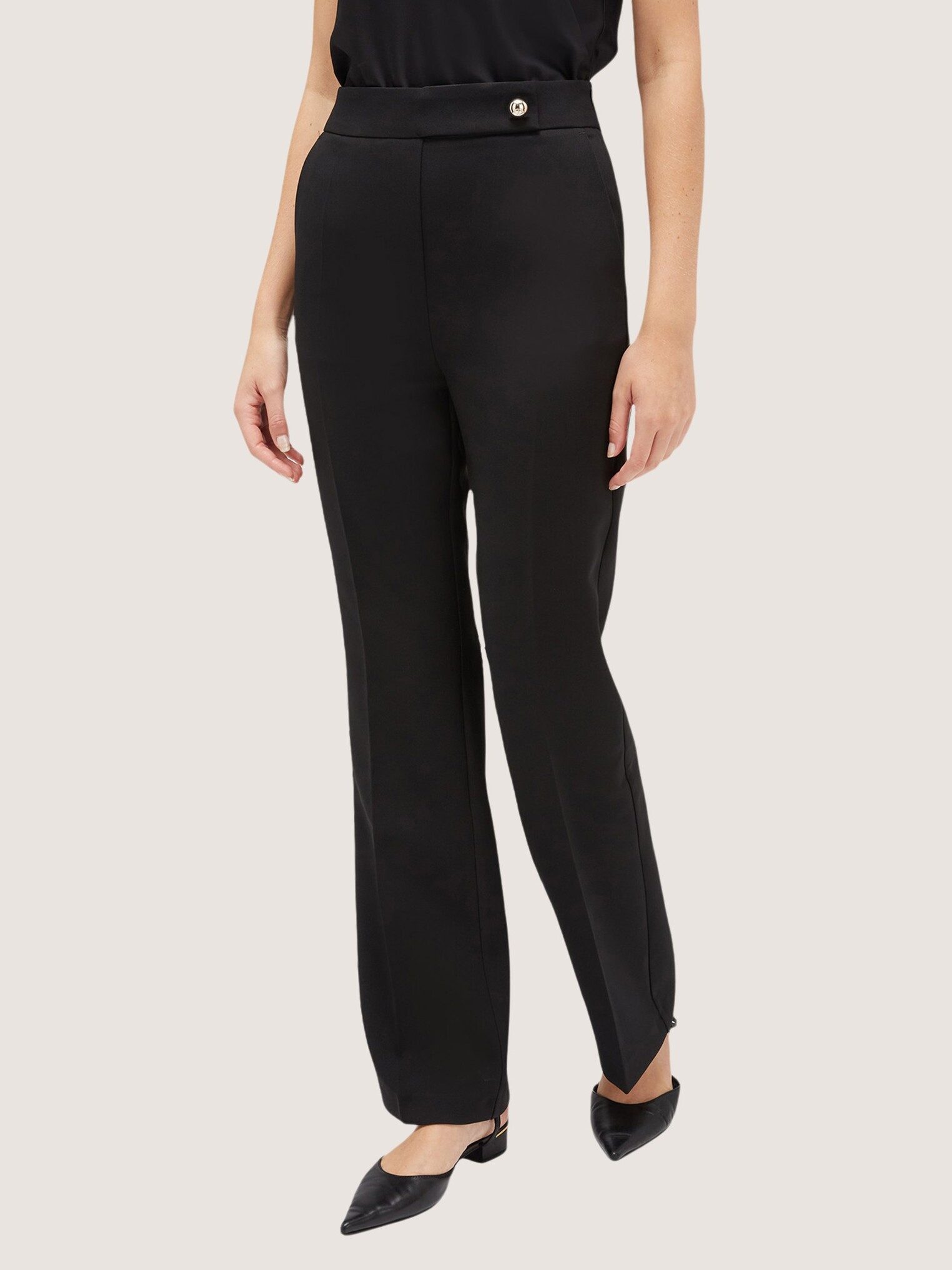 Pantalon flare en crêpe ; fermeture haute couture avec bouton métallique ; poches américaines insérées sur le côté, pli marqué au milieu des jambes