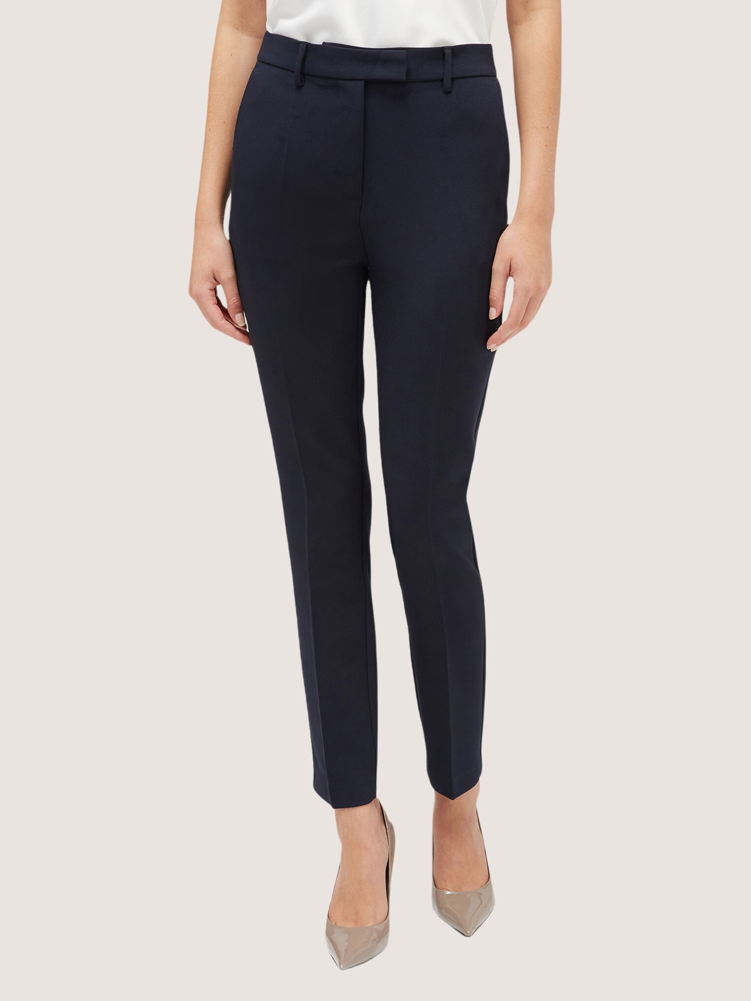 Pantalon coupe normale en tissu crêpe ; fermeture haute couture avec crochet métallique ; poches américaines insérées sur le côté, pli marqué au milieu des jambes