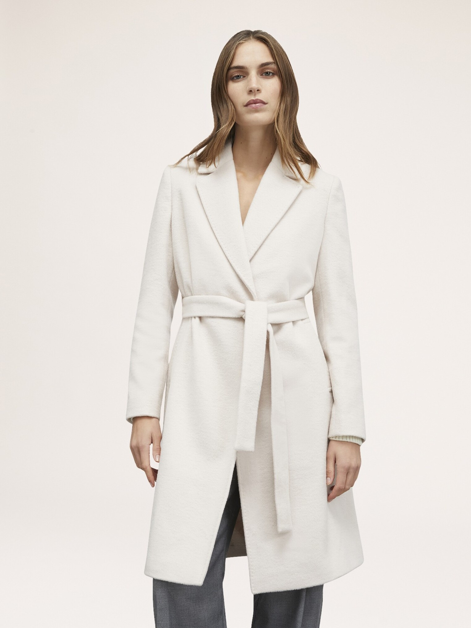 Manteau mi-long en drap de laine mélangée de couleur unie ; col à revers et manches longues, ceinture à nouer du même tissu ; poches verticales sur le devant, fente au milieu du dos