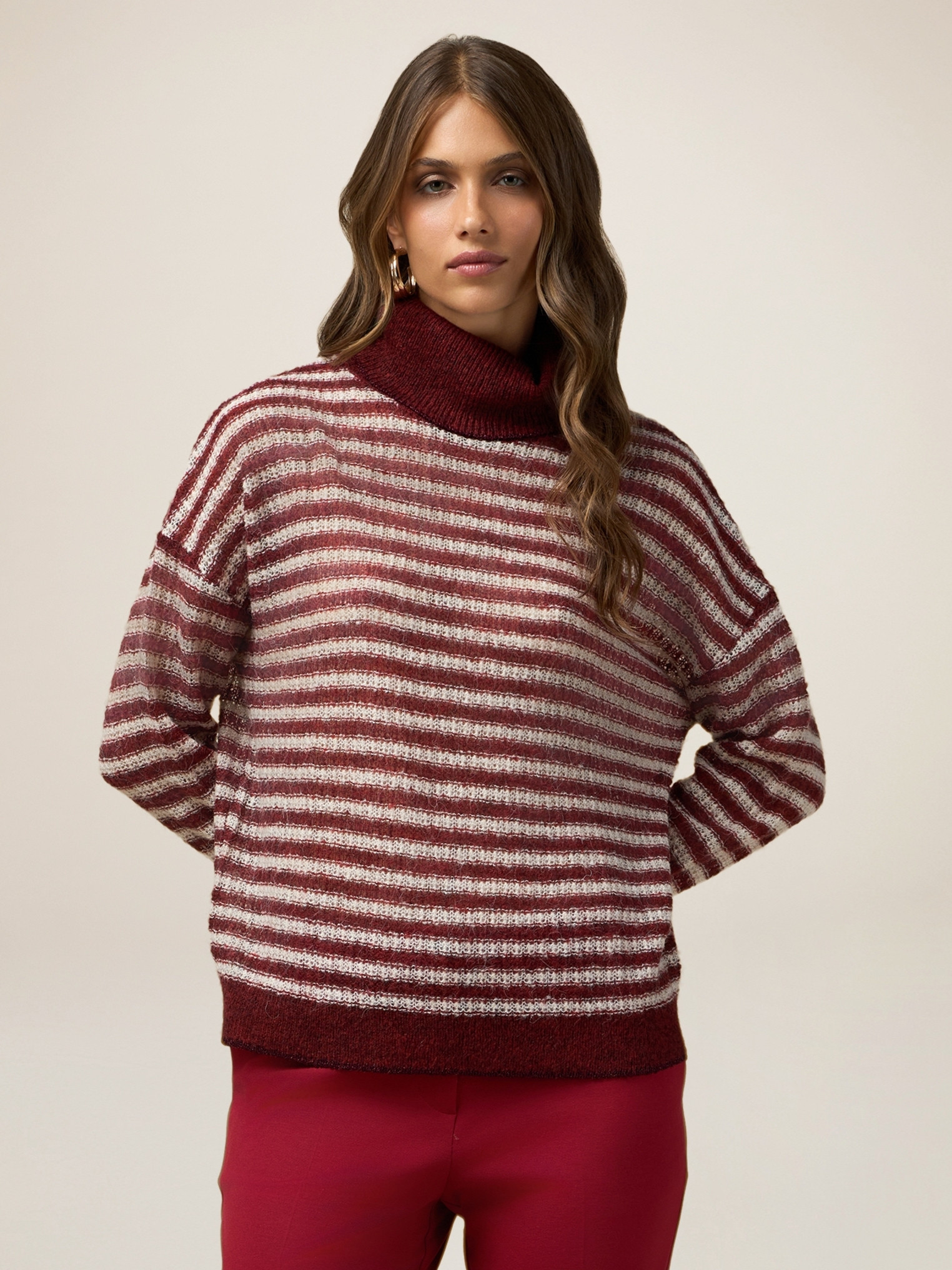 Pull à col roulé réalisé en doux fil mélangé de laine et alpaga ; à rayures ; bords de couleur unie avec détail de fil lurex.