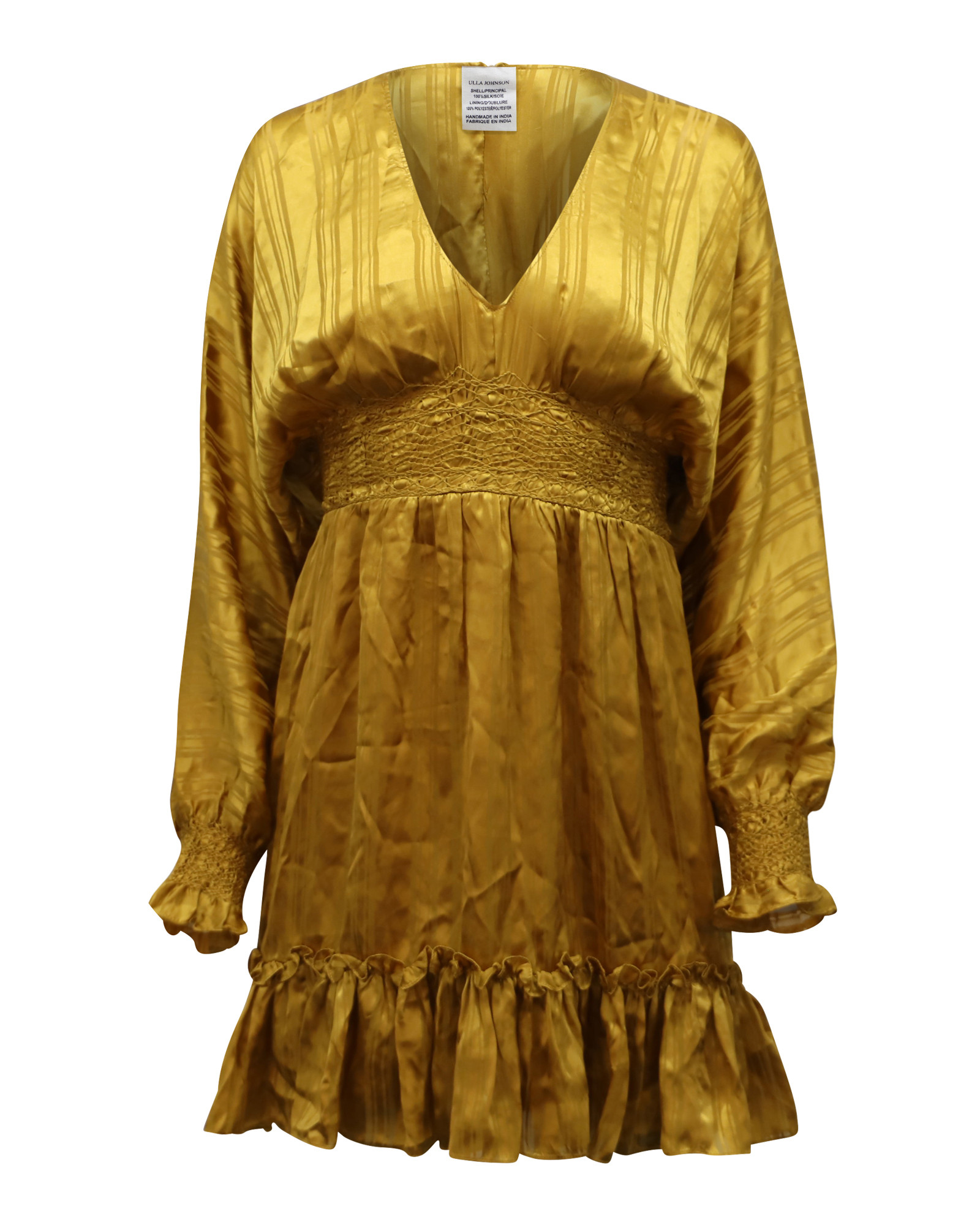 Brillez jusqu'à l'automne avec la robe Odette d'Ulla Johnson. Une palette dorée chaude cède la place à des détails smockés et cintrés qui confèrent une coupe flatteuse à cette mini surélevée. Mini-robe Ulla Johnson Odette en soie dorée Etat : très bon Matériel: Soie Taille: US0 Signe d'usure : légère usure UGS : 161862
