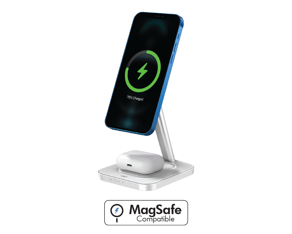 2 zones de Charge rapide sans fil Fini les câbles pour votre smartphone et vos Airpods compatible avec la recharge sans fil ! Posez-les simplement sur la base pour les recharger. Compatible MagSafe/Magnet Pour une recharge plus rapide de votre mobile, ce
