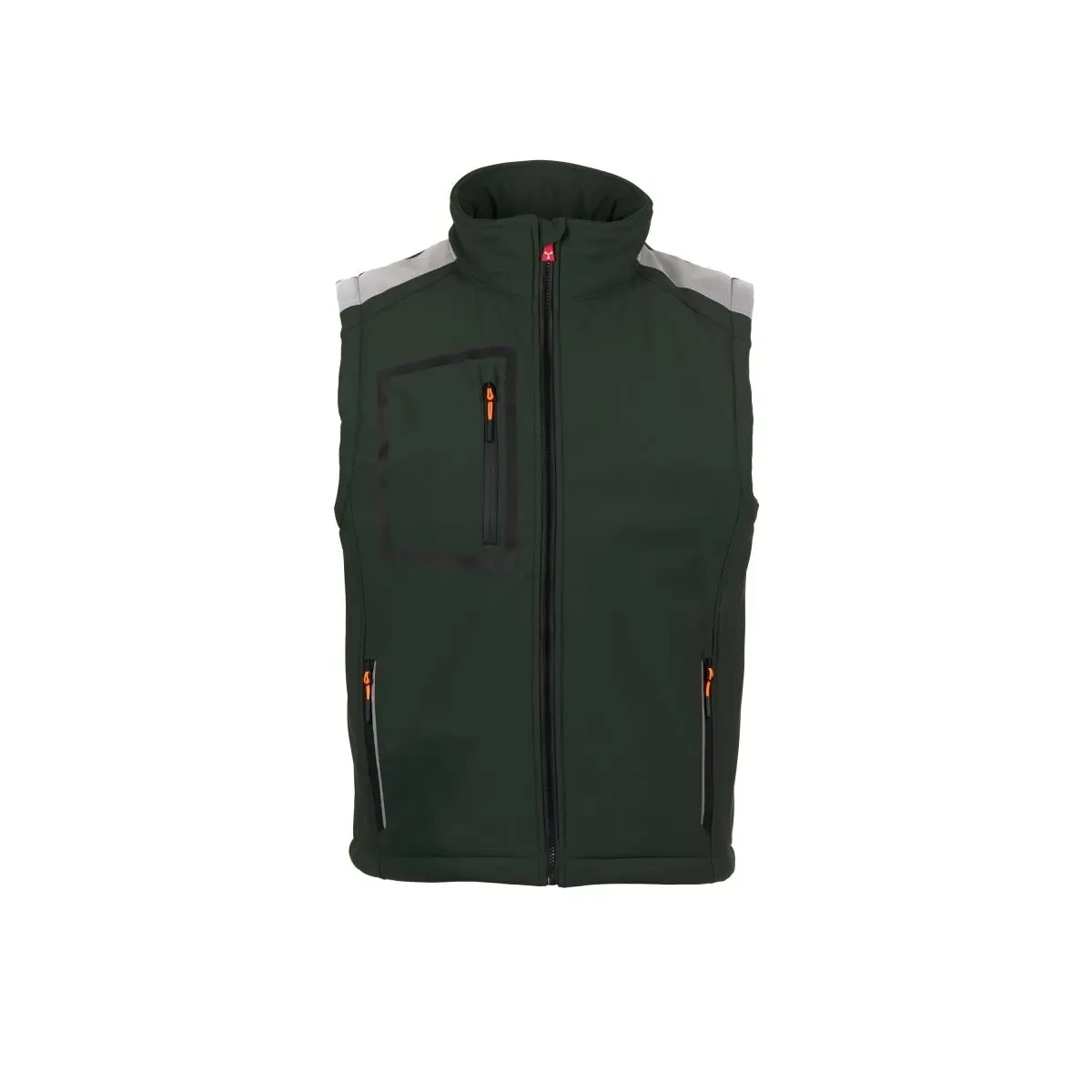 WP 8000 mm H₂O, WVT 5000 g/m² 24h. Gilet soft-shell rembourré pour homme, fermeture par zip SBS avec curseur en métal à verrouillage semi-automatique et tirette personnalisée. Col intérieur avec détails latéraux en fibre polaire. Bandes rétroréfléchissantes sur les épaules et au bas du dos. Poche thermosoudée sur la poitrine, fermée par zip enduit. Deux poches latérales, fermées par zip avec détail rétroréfléchissant. Tirettes fluorescentes. Deux poches intérieures : une poche poitrine profilée avec zip côté droit et une poche porte-tablette fermée par velcro. Bas réglable avec stoppeurs personnalisés. - Composition: 78% NYLON + 22% ÉLASTHANNE - Aspect: SOFT-SHELL - Poids: 330 GR/MQ - Emballage: 1/10