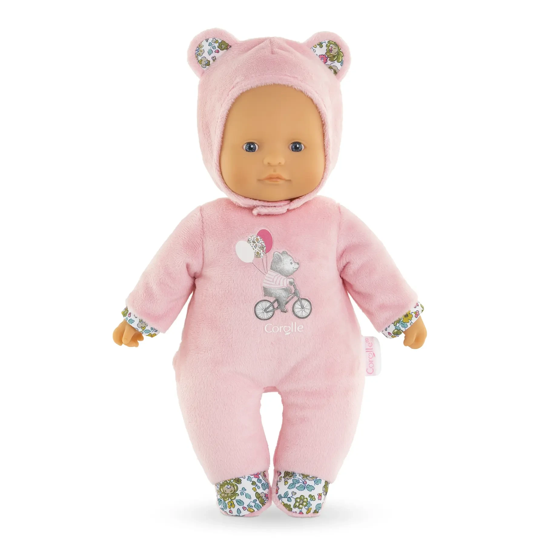 Poupon Pti'Coeur Ours Rose Le poupon idéal pour le premier anniversaire ou le premier Noël ! Ce premier "doudou-poupon" est parfait pour favoriser l'éveil des sens de votre enfant grâce à : sa toile de corps toute douce et non amovible, sa capuche munie de deux petites oreilles d'ours toutes mignonnes et faciles à attraper. Pti'Cœur Ours Rose a la peau blanche et les yeux bleus fixes. Son pyjama, qui ne peut pas être retiré, est rose tendre avec une délicate sérigraphie "ours à vélo" imprimée sur le torse. Le dessus de ses pieds, le biais des manches et l'intérieur de ses oreilles sont mis en valeur avec un délicat imprimé fleuri. Son petit plus : la capuche du Pti'Coeur Ours Rose peut être retirée, mais elle reste astucieusement attachée au poupon grâce à une petite languette située derrière la tête, pratique pour éviter de l'égarer ! Le petit poupon Pti'Cœur Ours Rose mesure 30cm et a un corps souple sans billes. Il est donc léger et parfaitement adapté aux petits bras et mains de votre enfant, qui pourra l'attraper et le manipuler très facilement. Le Pti'Coeur Ours Rose possède bien sûr tous les attributs d'un poupon Corolle : sa tête et ses mains sont en vinyle doux au toucher, et possèdent une délicate senteur de vanille, réconfortante pour les tout-petits. Quoi de pire pour un bébé qu'un doudou perdu ou oublié ? Pour éviter ce désagrément, notre Pti'Cœur Ours Rose possède une étiquette pour écrire le prénom de votre enfant ou votre numéro de téléphone... bien pratique pour éviter de gros chagrins ! Pti'Cœur Ours Rose est lavable à la main, en surface. mon doudou Corolle : Toi et moi, pour toujours. Doudou dès 9 mois