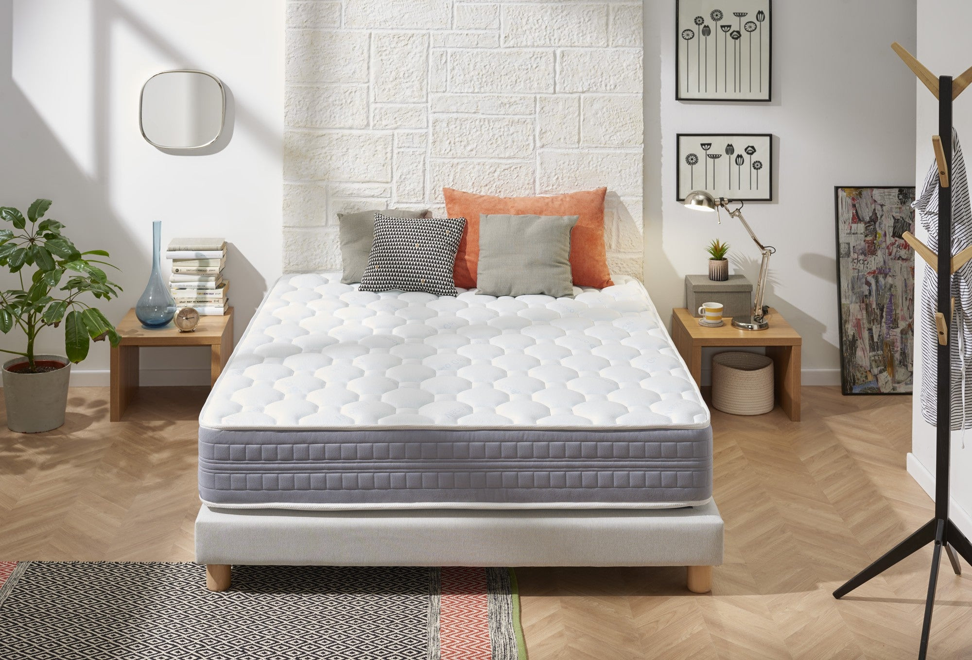 Le matelas visco Luxury GEL combine un système multicouche perforé hautement adaptable et haute densité, offrant un grand confort. La fermeté de son noyau spécial indéformable Bio Nature fait de ce matelas un luxe pour le repos. Caractéristiques techniques : • Hauteur : 27 cm +/2. • Fermeté : Moyenne-Élevée. • Rembourrage supérieur : 4 cm de Viscoélastique + Supersoft. • Noyau HR haute densité : structure à pores ouverts, régulant la meilleure température pour chaque saison de l'année. Ce matelas représente la nouvelle génération de matelas sans ressorts. La mousse que nous utilisons permet au matelas de toujours retrouver sa forme initiale. • Matelassage supérieur continu : chaque housse est fabriquée avec un motif qui utilise des formes géométriques élaborées sans espaces ni lacunes entre les coutures. En combinant les différentes couches de haute et de faible résilience, un effet similaire à l’apesanteur est obtenu. • Rembourrage inférieur : tissu tridimensionnel entrelacé 3D hautement respirant et doux au toucher. • Bordure : Couture de sécurité spéciale sur la bordure pour une meilleure compacité. • Bande latérale : Tissu velours et rembourrage à ultrasons. Traitements et certificats de nos matelas : • Fonction hygiénique Sanitized® (spécialiste du traitement antimicrobien des textiles) qui protège les matelas contre la formation de moisissures et d'algues, réduit la présence d'acariens et offre une protection longue durée. • Anti-humidité : Il est fabriqué avec un tissu de dernière génération, qui permet une circulation d'air optimale, empêchant l'accumulation d'humidité et gardant le matelas ventilé, créant la température parfaite pendant que vous dormez. • Silencieux : Grâce à sa structure et sa composition, il ne produit aucun bruit lors des mouvements que notre corps effectue pendant son sommeil. Indépendance du lit. • Nos matelas ont été créés pour respecter le bon alignement de notre colonne vertébrale pendant que nous nous reposons. • Tous les tissus que nous utilisons pour fabriquer ces matelas sont conformes à la réglementation OEKO-TEX® Standard 100 (produits sans substances nocives). Mode d'emploi, entretien et garantie : • Le matelas est envoyé roulé et emballé sous vide. • Il est conseillé de ne pas utiliser le matelas dans les 10 heures suivant son déballage. • Protégez-le avec un étui ou un protecteur. Passez l'aspirateur au moins une fois par mois. • N'oubliez pas qu'il doit être sur une surface uniforme et ne pas laisser d'espaces qui pourraient provoquer des déformations. • Retournez-le fréquemment. Garantie 2 ans. Fabriqué en Espagne.