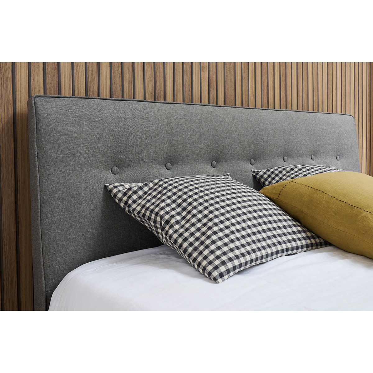 lit double 160x200 en tissu gris avec tête de lit intégrée, réchauffera l'ambiance et apportera à votre espace nuit, la touche de confort caractéristique des chambres cocooning.