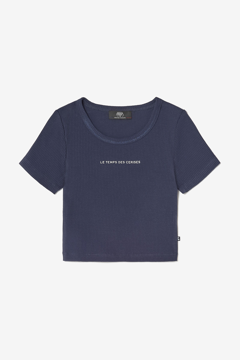 Crop top bleu marine au tissu côtelé manches courtes stretch avec col à fil brillant argenté et inscription "Le Temps des Cerises" blanc en relief.
