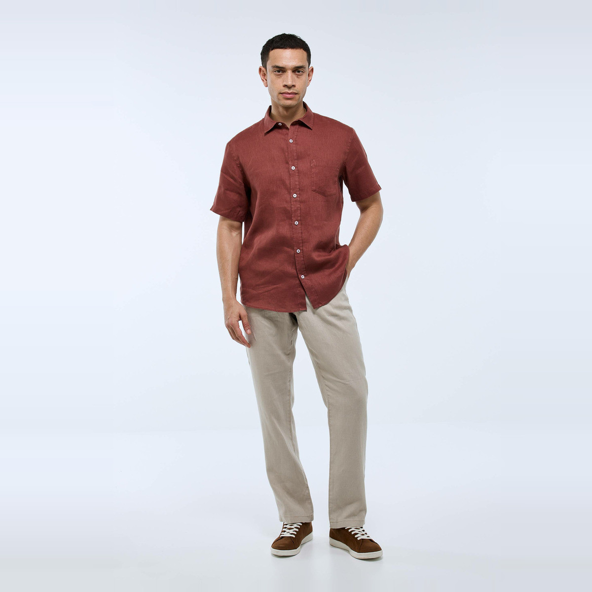 Pantalon straight en lin certifié European Flax, 2 poches italiennes devant, ouverture par zip et bouton, 2 poches au dos avec bouton