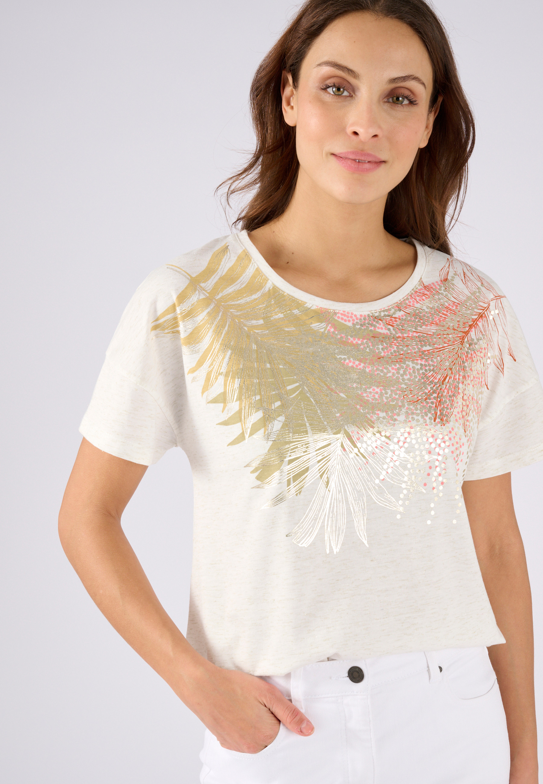 Information sur l'offre : Découvrez ce t-shirt en fil brillant, orné d'un motif végétal délicat placé sous l'encolure. Ce t-shirt se distingue par son éclat subtil qui attire tous les regards. Maille jersey effet flammé. Avec ses manches en forme T, emmanchure descendue, il offre une coupe décontractée tout en restant chic, parfait pour toutes les occasions. Longueur de ce tee-shirt femme brillant 61 cm environ.