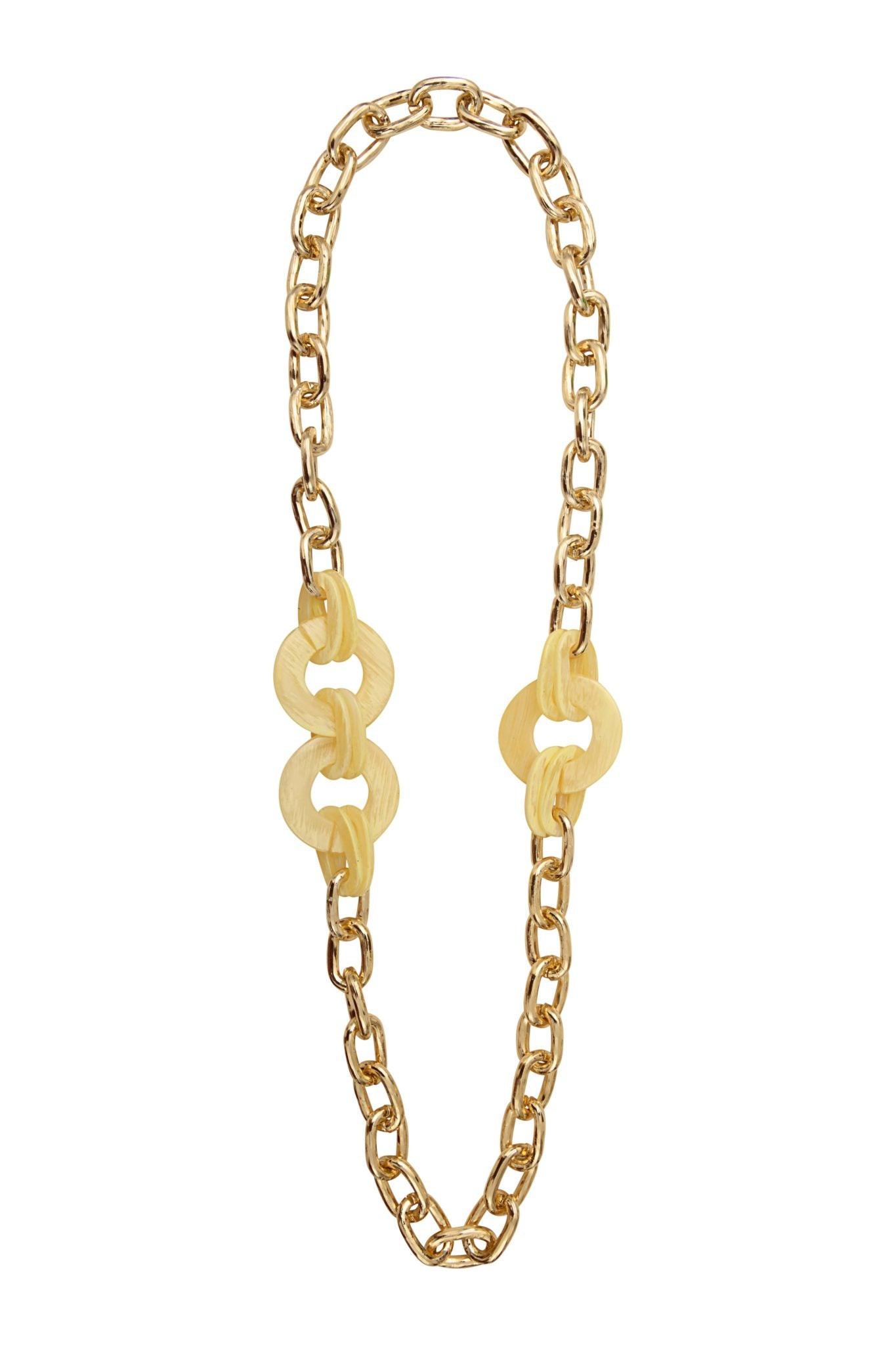 - Matières : La chaîne en métal doré ajoute une brillance élégante, tandis que les maillons en acrylique offrent une texture légère et chaleureuse.