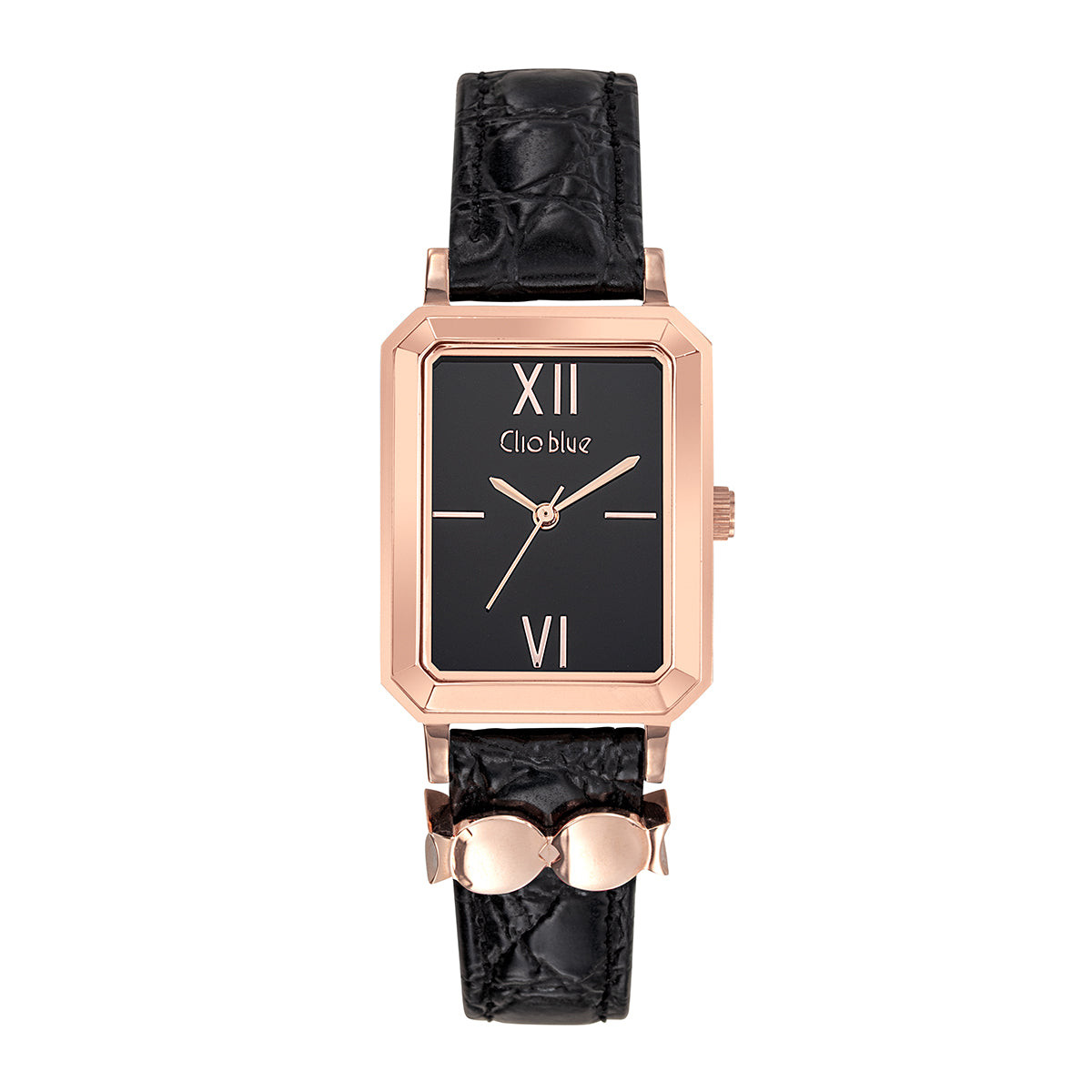 Le cadran noir est orné de chiffres romains en rose doré, créant un contraste visuel saisissant qui attire l'œil. Cette combinaison de couleurs fait de la montre un véritable bijou, parfait pour les occasions spéciales ou pour un usage quotidien.