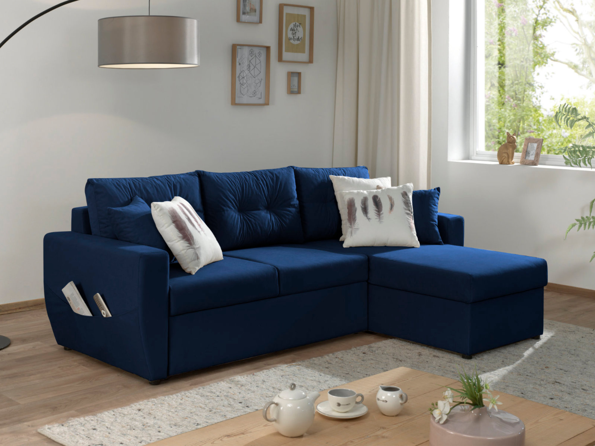 Le canapé d’angle Astoria possède une poche sur l’accoudoir afin d’y ranger télécommandes et magazines. Une fonction convertible est aussi disponible en dépliant le tiroir se trouvant sous l’assise, pratique pour accueillir vos proches occasionnellement. Vous trouverez aussi un coffre de rangement sous la méridienne, pratique pour y glisser plaids, coussins. A droite ou à gauche, choisissez la position de l’angle grâce à sa fonction réversible.