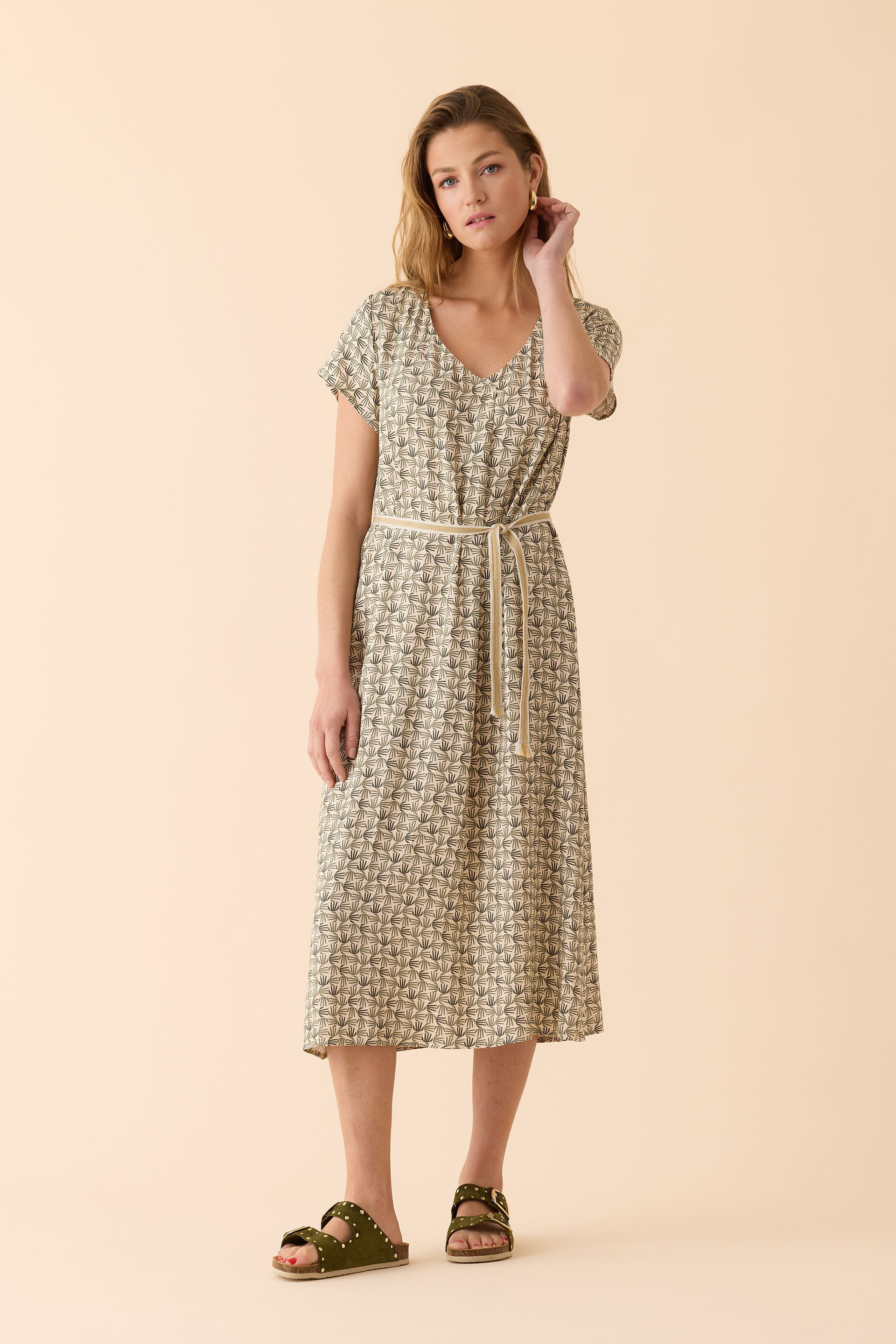 Facile à porter, misez sur la robe 'Osier' manches courtes à l'imprimé graphique et minimaliste, col V avec pli, longueur midi, ceinture galon fantaisie, médaillon Diplo, coupe légèrement évasée. Hauteur : 118cm. Notre mannequin mesure 1m72 et porte une taille 0 ou 36 pour les hauts, taille 36 pour les bas Composition : 100% Viscose