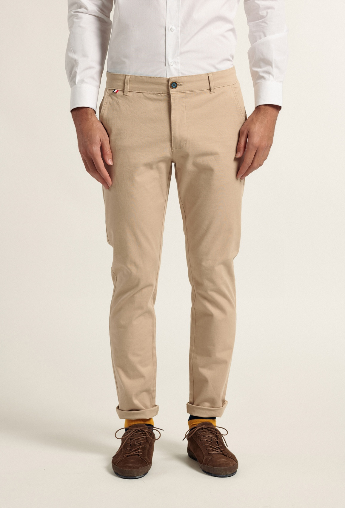 Pantalon chino en coton et élasthanne pour plus de confort. Boutons personnalisés en marron. Broderie du logo sur la poche droite.