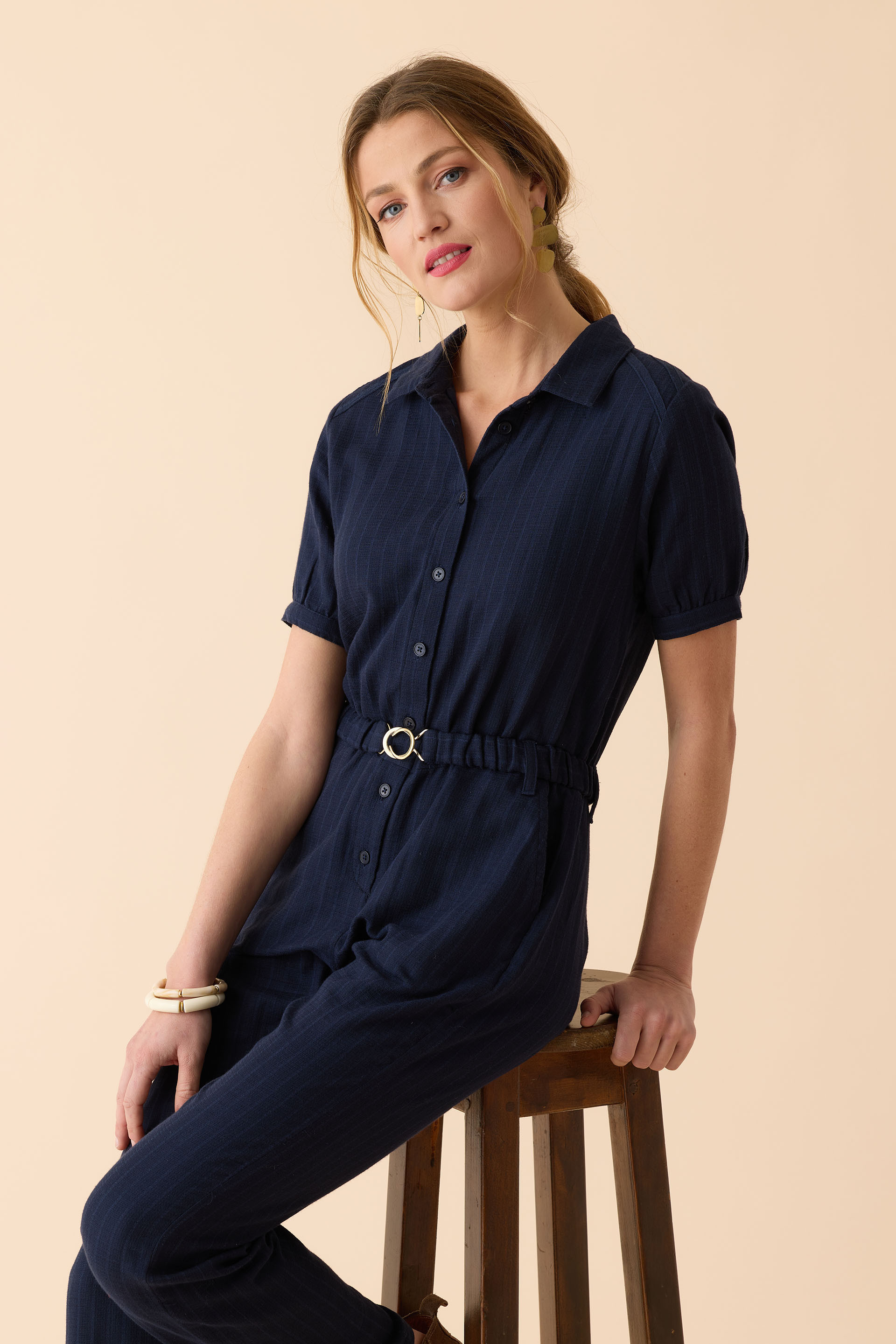 Information sur l'offre : Intemporelle et casual chic, optez pour la combi-pantalon unie en gaze de coton rayée, col chemisier, ouverture boutonnée devant, détails galons épaules, manches coudes bouffantes avec poignets, poches italiennes, ceinture élastiquée amovible avec attache métal, coupe droite, médaillon Diplo. Hauteur : 1m43 Notre mannequin mesure 1m72 et porte une taille 0 ou 36 pour les hauts, taille 36 pour les bas Composition : 100% Coton