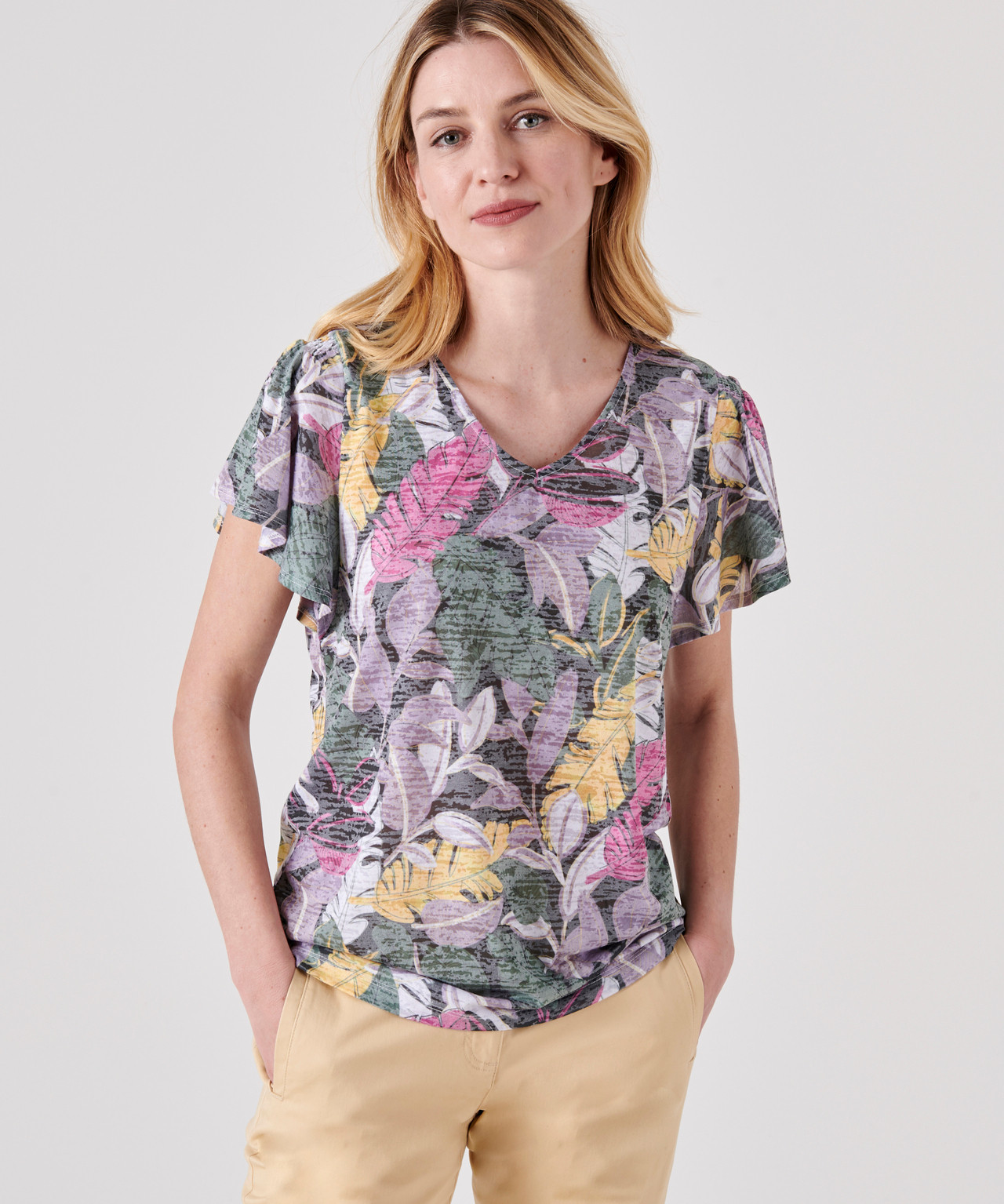 Information sur l'offre : La maille dévorée met en valeur l'imprimé végétal coloré de ce tee-shirt. Cette maille est légère et agréable à porter : parfaite pour les belles journées d'été. Un top coloré à associer à un pantalon ville uni et une veste pour un look city élégant ou à un jean pour une silhouette plus décontractée. Les manches papillon sont montées sur un empiècement couvrant pour éviter une emmanchure trop dégagée. Petit plus : un détail smocké sur les épaules. Coupe droite pour un porté facile. Col V. Longueur du tee-shirt femme 64 cm env.