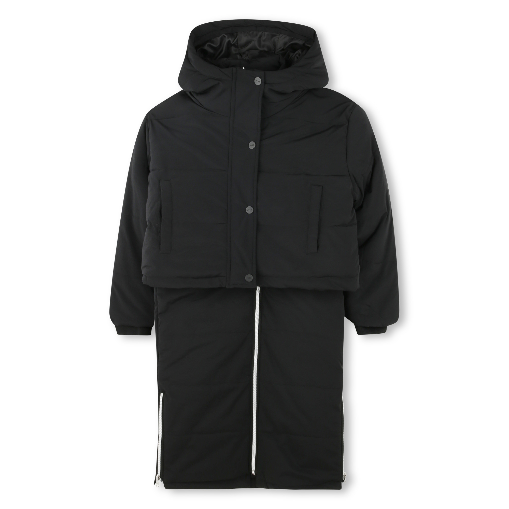 Cette doudoune aux différents éléments multiplie les possibilités. La doudoune longue sans manche comporte des poches et des glissières latérales. Un bord-côte constitue les poignets de la doudoune courte à capuche avec poches.