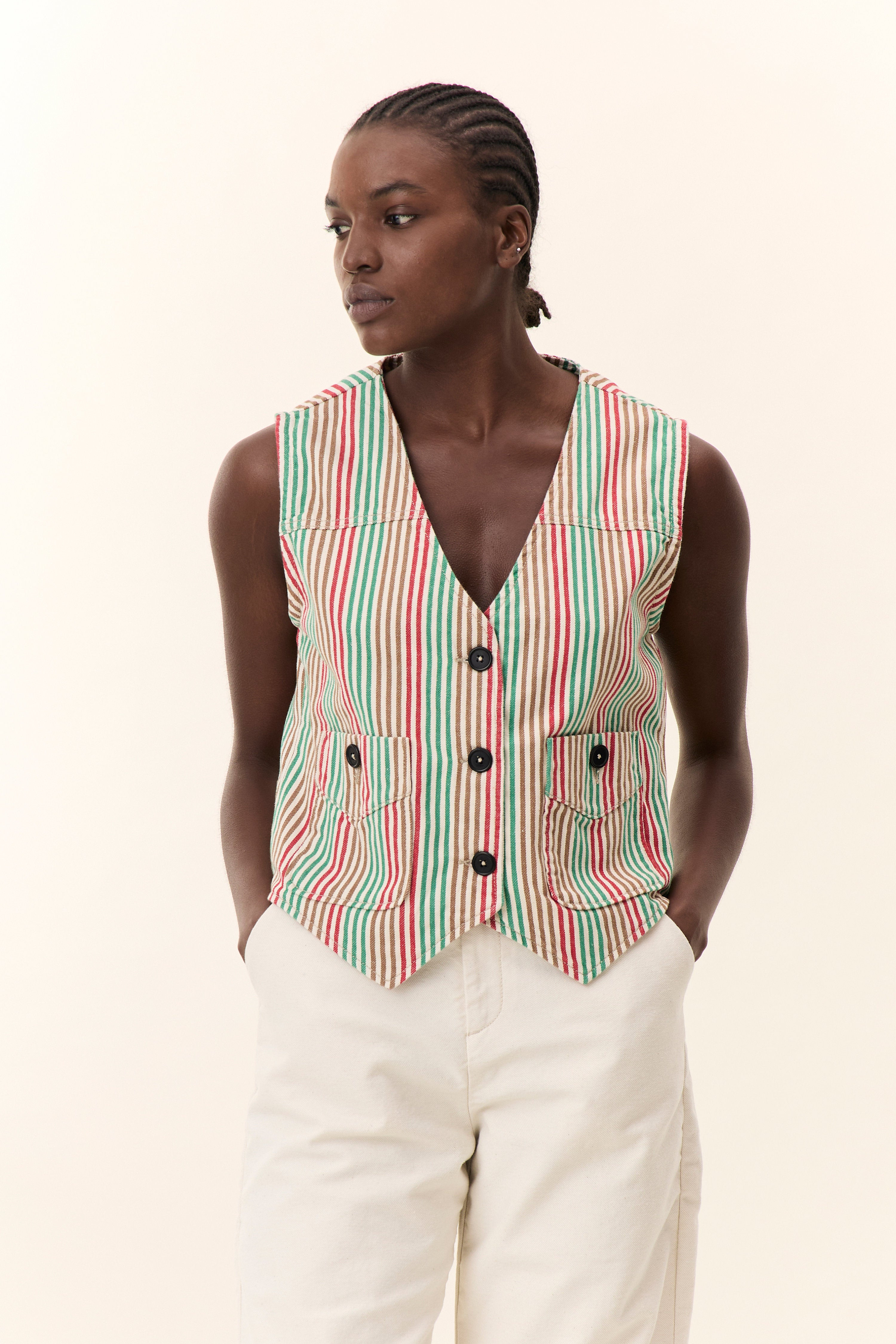 Le gilet Vish Strp mixe l’esprit vintage et la touche boyish chic. Avec ses fines rayures façon workwear revisité, il joue sur les codes du vestiaire masculin tout en restant très féminin. Son col en V, ses poches boutonnées et sa coupe ajustée en font un allié parfait pour une silhouette structurée. À porter en total look avec ou sur un t-shirt blanc pour une allure plus casual.