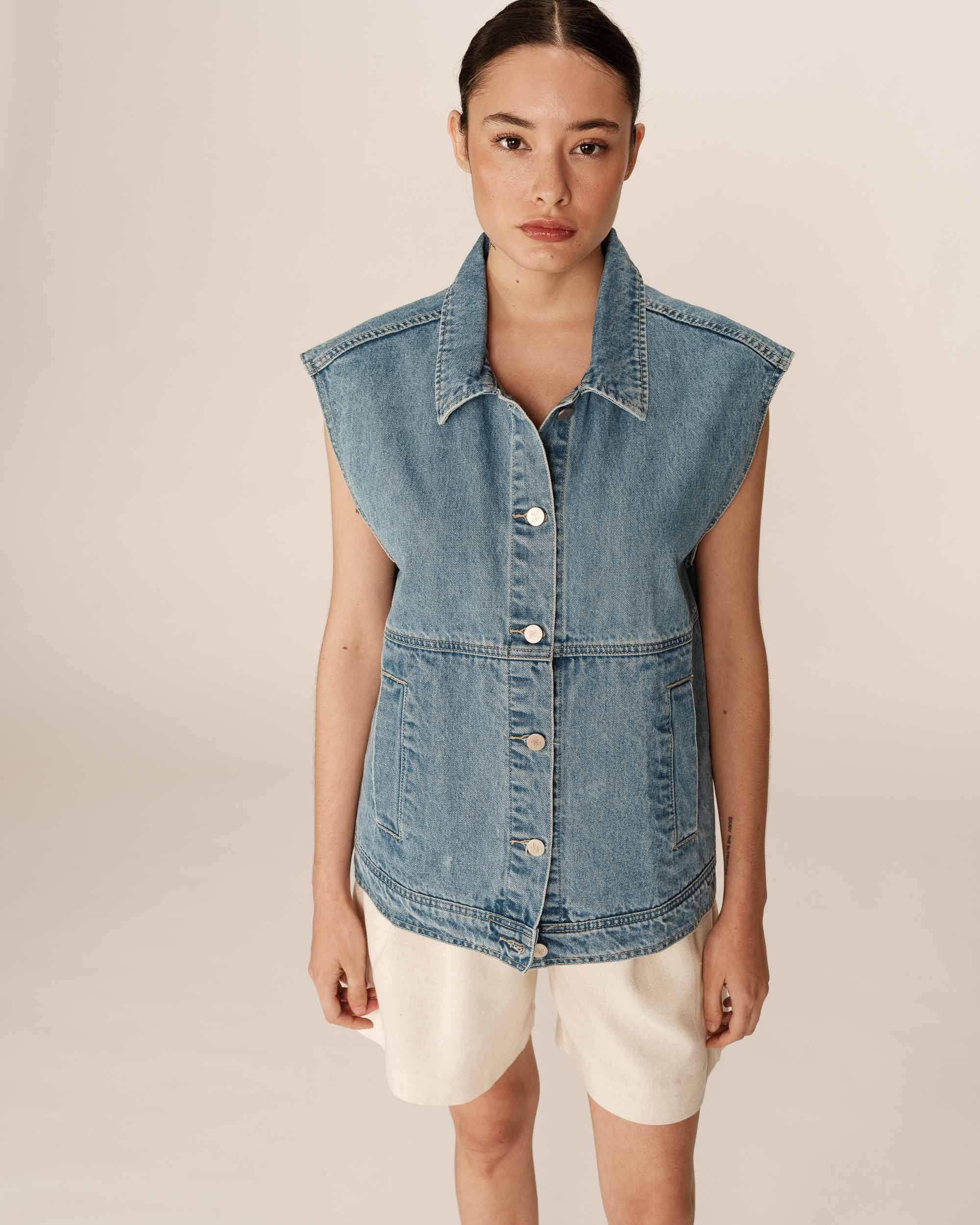 Le denim se réinvente dans le vestiaire de la collection et propose la veste sans manches PAULETTE qui dessine une silhouette casual et moderne. La coupe boxy et les poches sur le devant proposent une allure décontractée et pratique. Les détails travaillés tels que, le col chemise classique, le jacron en cuir et les boutons monogrammés G&M, ajoutent une touche de sophistication. Confectionnée dans un tissu denim en 100% coton, la veste en jean PAULETTE rejoint notre gamme en fibres naturelles 'Un Brin de Vert'.