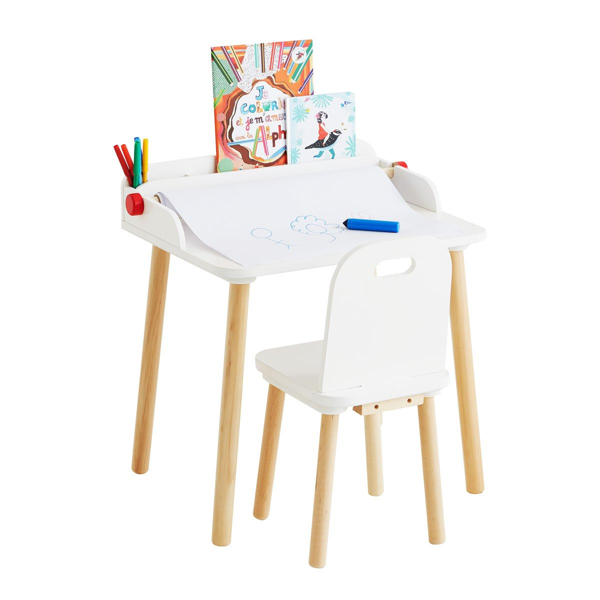 Ce petit bureau accompagne votre enfant dès ses premiers apprentissages. Très complet, il possède un espace pour faire tenir des cahiers de coloriages, ce qui l'invite à développer son sens de l'organisation et qui lui permet d'apprendre à dessiner. Les bordures à chaque extrémité lui assurent que rien ne tombe tout en lui donnant un sentiment de sécurité. Le dérouleur lui permet de rajouter un rouleau de papier pour dessiner ou peindre. Pratique, sa petite taille trouvera aussi bien sa place dans la chambre de votre enfant que dans le salon familial ! La taille est idéale pour un enfant qui est en maternelle.