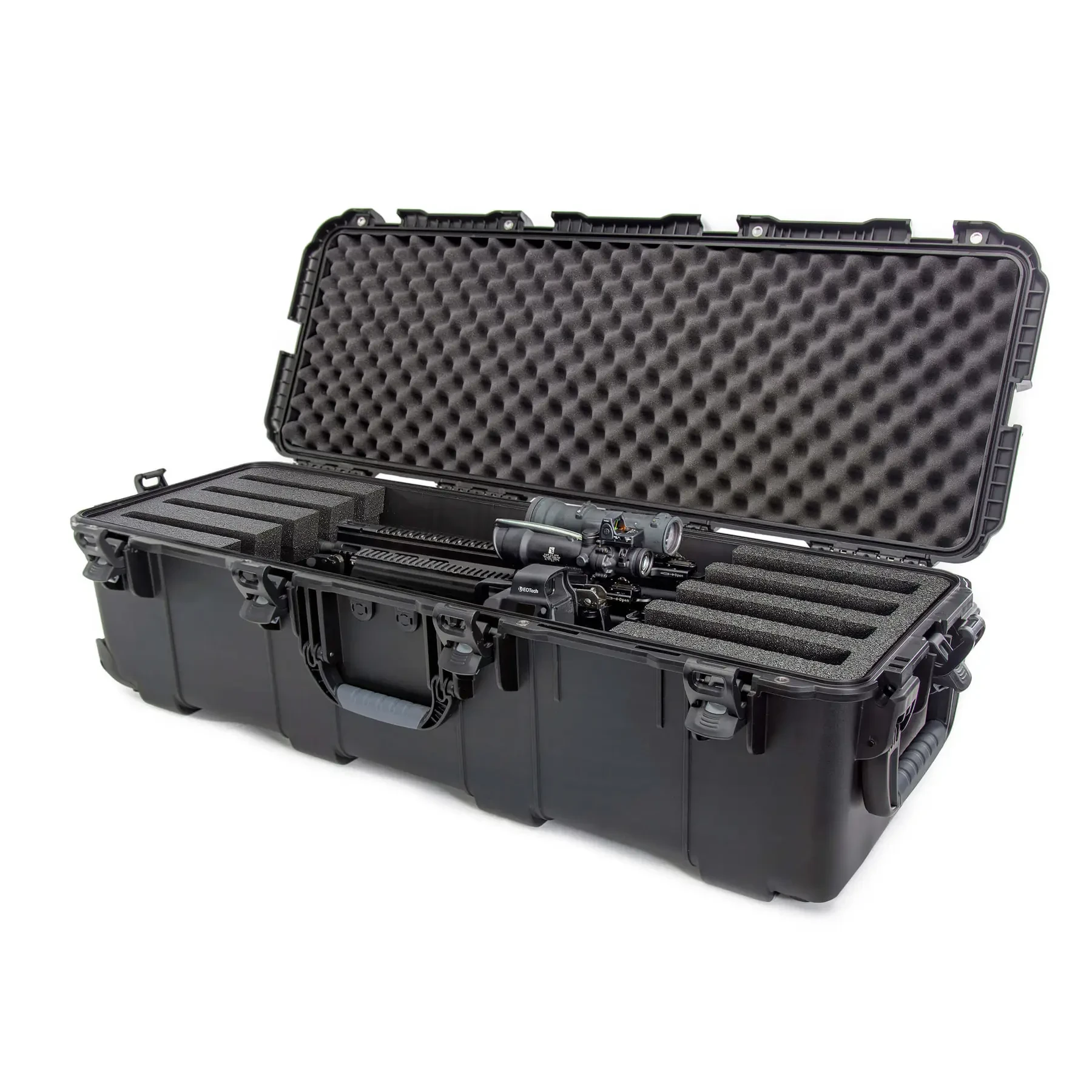Conçue pour organiser, protéger, transporter et survivre dans des conditions difficiles, la sacoche rigide étanche 988 4-Up Rifle valise est impénétrable et indestructible grâce à sa coque en résine NK-7 légère et résistante et à ses six (6) loquets PowerClaw. Taille extérieure (LxLxH) 44.9 in x 16.3 in x 13,6 pouces 1140 mm x 413 mm x 344 mm Dimensions intérieures (LxLxH) 41.7 in x 13.6 in x 12,5 pouces 1060 mm x 346 mm x 318 mm Poids (à vide) 24 lb | 10,9 kg 10,9 kg Profondeur du couvercle 2.8 in | 70 mm Profondeur de base 9.8 in | 248 mm Plage de température Min -67°F (-55°C ) | Max 158°F (70°C) Flottabilité maximale 284 lb | 128,8 kg 128,8 kg Trous de cadenas 0,3 in | 7,62 mm 7,62 mm Matériel Résine légère NK-7 Garantie Garantie à vie et garantie de satisfaction de 30 jours Bagage à main en avion Non