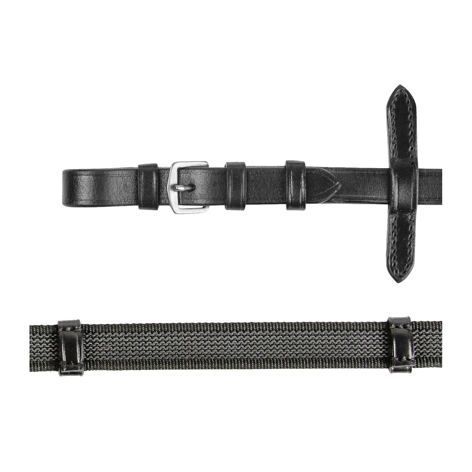 Avec revêtement en caoutchouc ouvragé. Avec arrêtoirs en cuir et arrêtoirs de martingale. Gamme de rênes fabriquées dans un cuir de qualité supérieure, excellente finition. Bouclerie en acier inoxydable. Largeur : 19 cm