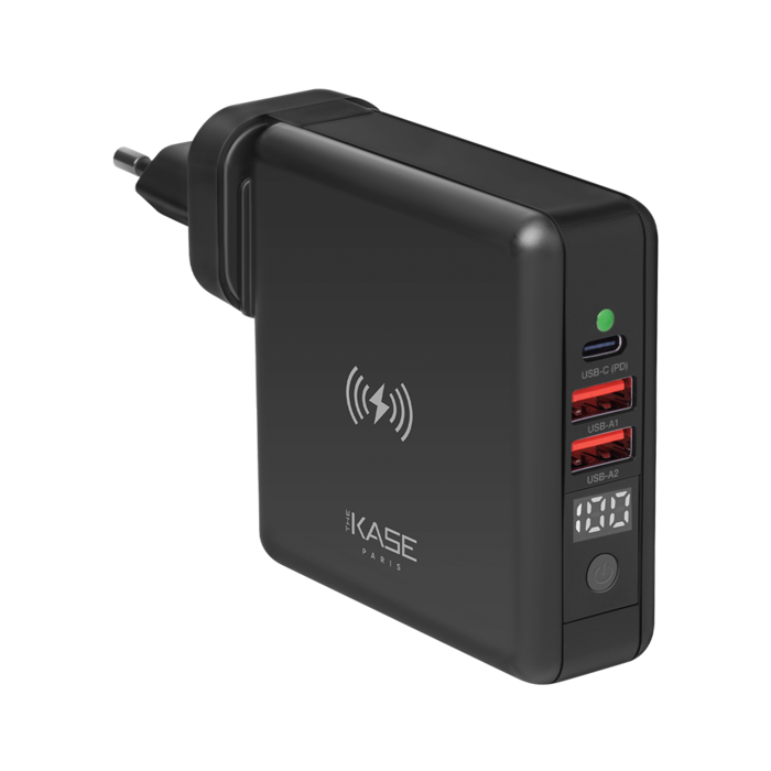Chargez trois appareils simultanément, ainsi que la batterie, lorsqu'elle est branchée sur une prise de courant en mode chargeur. Débranchez la prise de courant, retirez la prise européenne et chargez vos périphériques à l'aide des deux ports et du chargeur sans fil en même temps, comme une batterie de 10 000 mAh. Le chargeur sans fil est même compatible avec la plupart des coques, sauf celles qui sont métallisées/magnétiques à cause des interférences électromagnétiques potentielles.