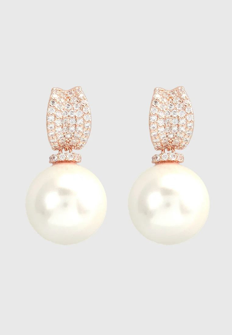 Ensemble de 2 boucles d'oreilles en métal doré rose avec cristaux blancs et perles. Longueur: 2,2 cm. Garantie de 2 ans. Le produit est livré dans un boite avec logo.