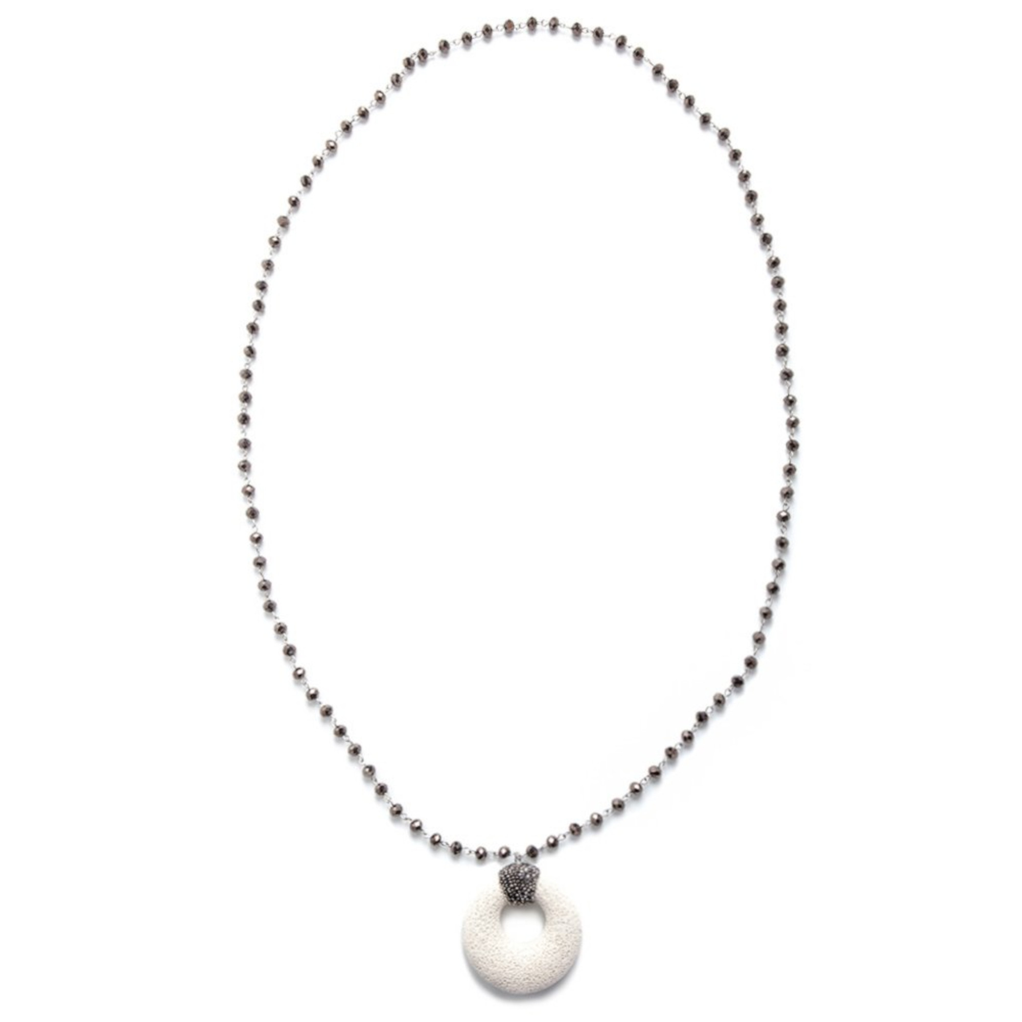 Collier en acier avec cristaux grises. Pendentif en pierre de lave blanche et cristaux noirs. Longueur: 98 cm. Fermoir mousqueton. Plaque personnalisée avec logo. Garantie de 2 ans. Le produit est livré dans un boite avec logo.